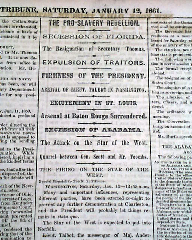 Background: This issue of the New York Tribune serves as a high-tension snapshot of a nation on the precipice, published just as the "secession dominoes" were falling with dizzying speed. By January 12, 1861, the abstraction of political debate had shifted into the reality of armed conflict, evidenced by the headline regarding the firing on the Star of the West—an event that signaled the end of peaceful reconciliation. The paper’s aggressive use of terms like "Treason" and "Traitors" reflects the editorial fire of Horace Greeley, who used his platform to pivot Northern public opinion from compromise toward a "firmness" in the presidency. Amidst the heavy reports of Florida and Alabama leaving the Union, the inclusion of "The Pony Express" serves as a poignant reminder of the era's dual nature: a country expanding its frontiers and technological reach even as its core political fabric was being violently torn apart.