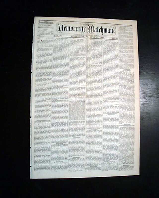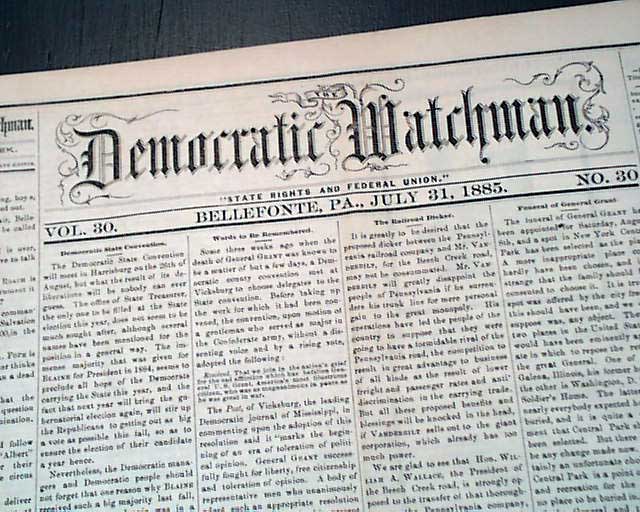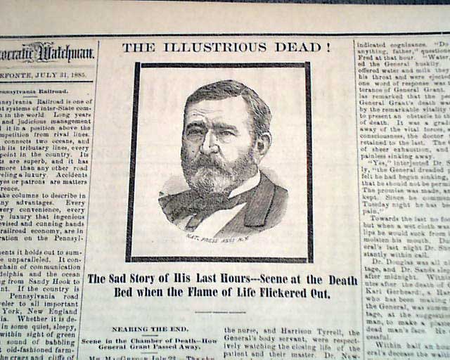 THE DEMOCRATIC WATCHMAN, Bellefonte, Pennsylvania, July 31, 1885 The most notable content is on page 2 which features a print of President Ulysses S. Grant headed: "THE ILLUSTRIOUS DEAD ! " and captioned: "The Sad Story of His Last Hours--Scene at the Death Bed When the Flame of Life Flickered Out".