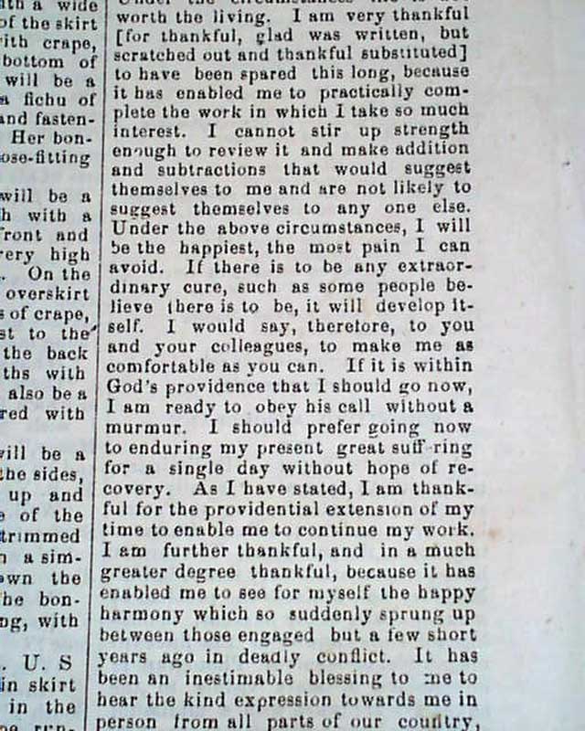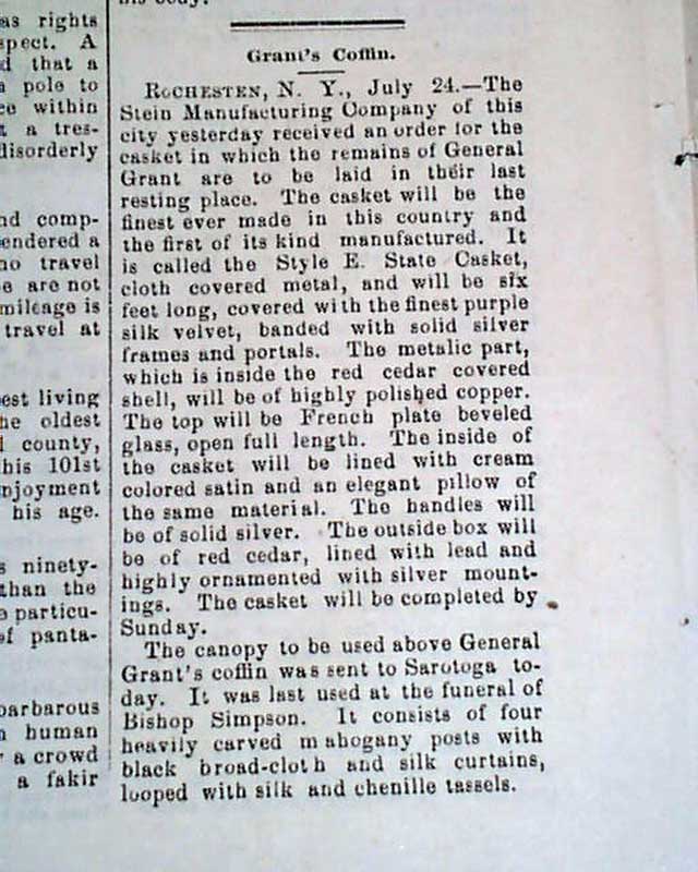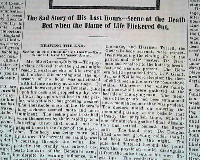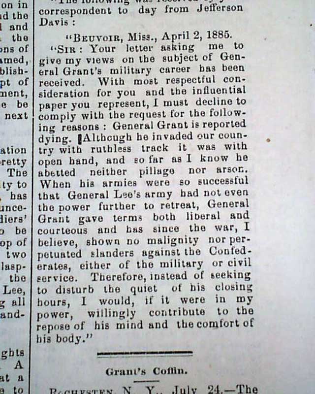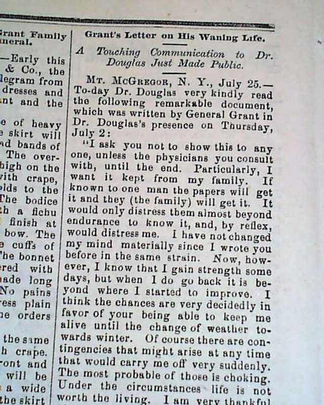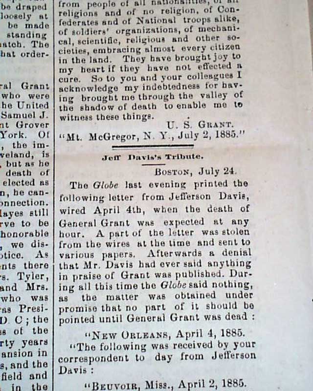 The article is very descriptive, headed: "Nearing the End - Scene in the Chamber of Death--How General Grant Passed Away". And page4 has half a column: "Grant's Letter on His Waning Life" signed in type: U.S. Grant, followed by: "Jeff Davis's Tribute" and then: "Grant's Coffin".