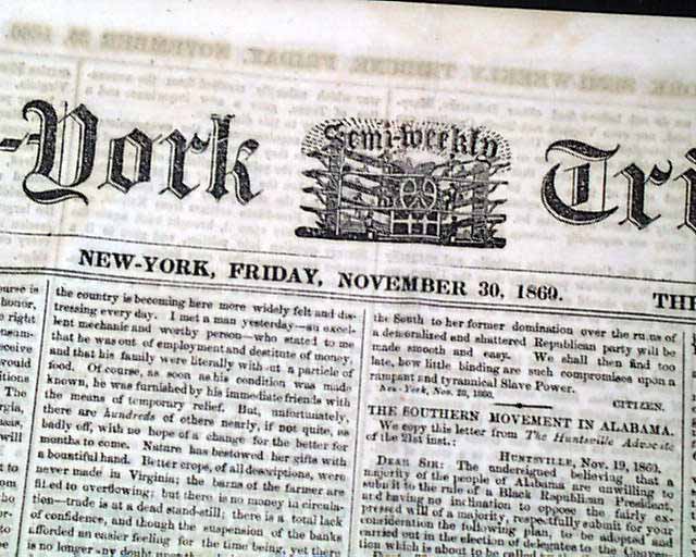 NEW YORK SEMI-WEEKLY TRIBUNE, Nov. 30, 1860  The top of the front page has: "The Secession Movement" "Buchanan And Secession" and more. Page 2 has: "Slavery as an Element in Our Politics" "The Strength of Secession" and "Secession as a Right".