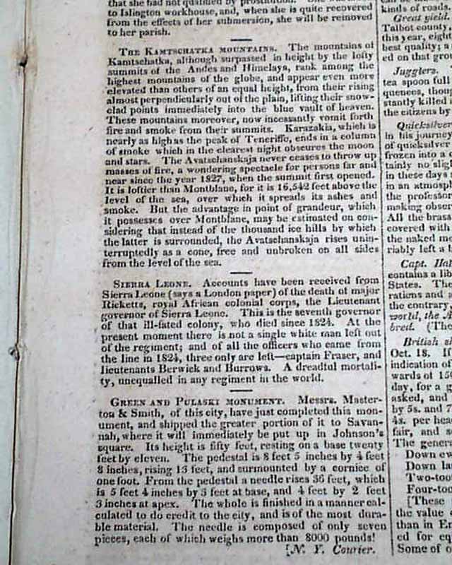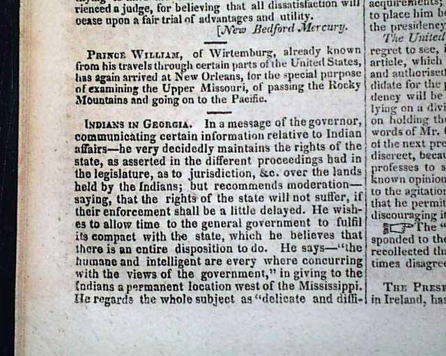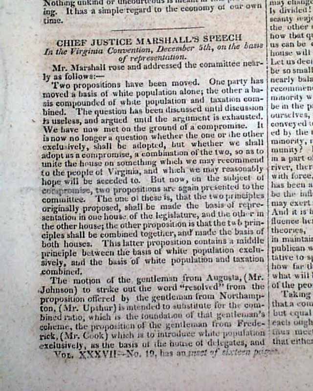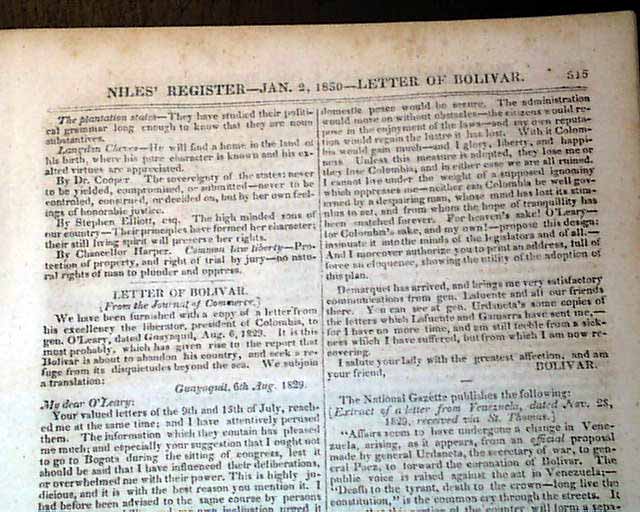 Among the other reports in this issue are: "Chief Justice Marshall's Speech", much reporting from Congress, "Indians in Georgia", much on the "Navy Department", "Letter of Bolivar" which is signed by him: Bolivar, and more.