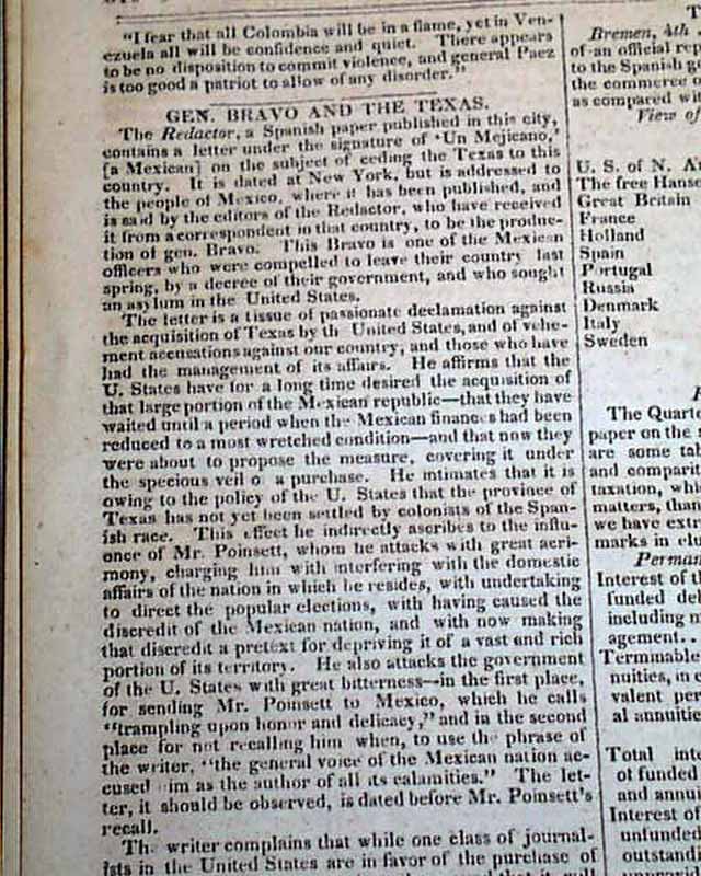 One of the articles is headed: "Gen. Bravo and The Texas" with portions including: "...on the subject of ceding the Texas to this country...The letter is a ...passionate declamation against the acquisition of Texas by the United States, & of vehement accusations against our country...He affirms that the U. States have for a long time desired the acquisition of that large portion of the Mexican republic..." with much more, taking almost an entire column.