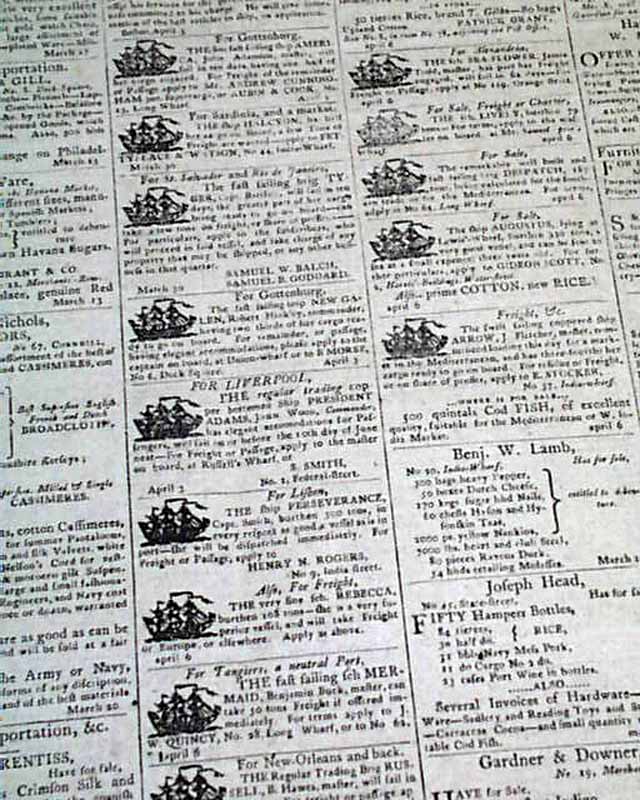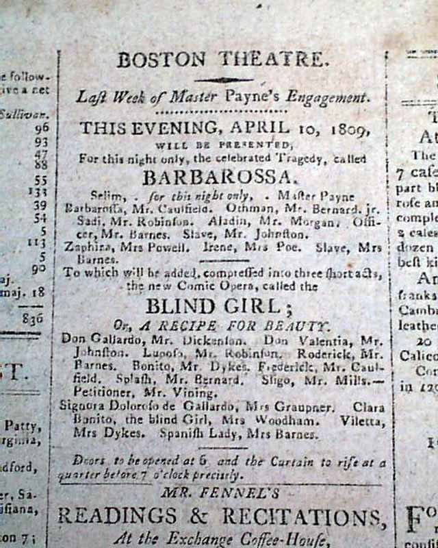 A curious literary item here as the top of page 3 has an advertisement for the "Boston Theatre" for the performance of: "BARBAROSSA", a theatrical performance, with one of the actors being Edgar Allan Poe's mother ("Mrs. Poe) playing "Irene" (see image)