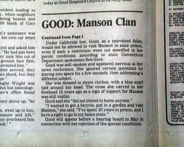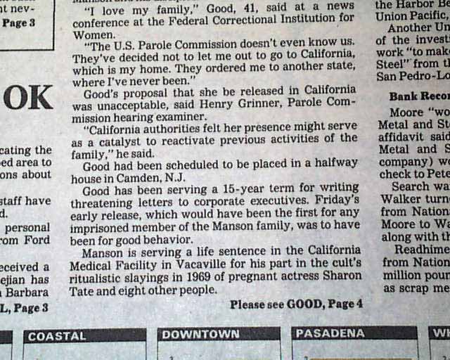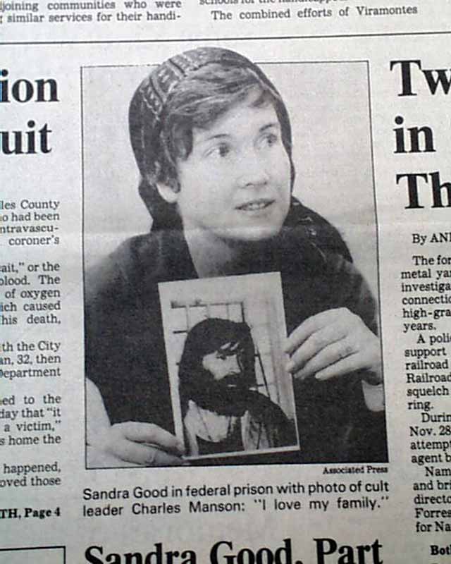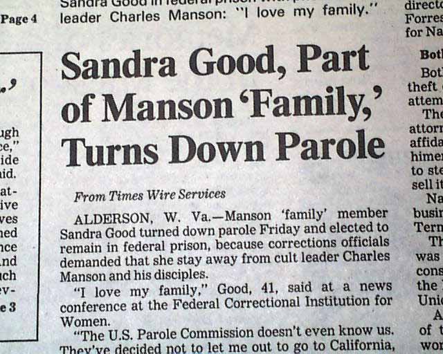 The front page of section II has a two column heading: "Sandra Good, Part of Manson 'Family,' Turns Down Parole" with photo of Good. (see images)