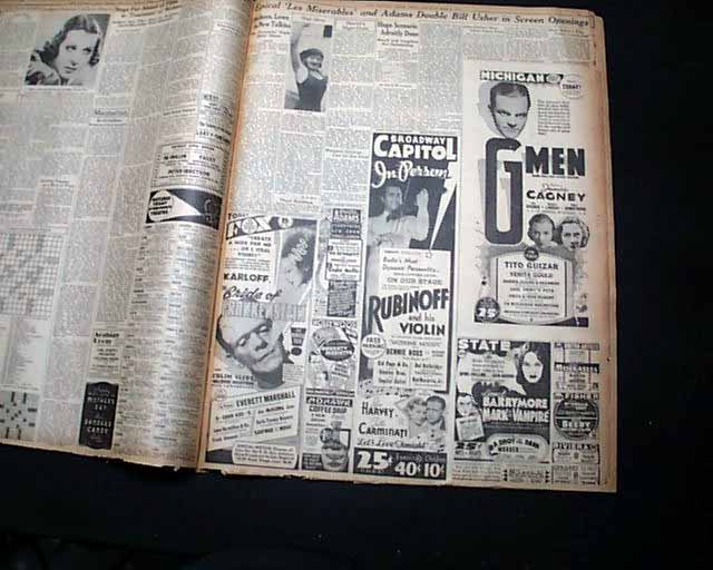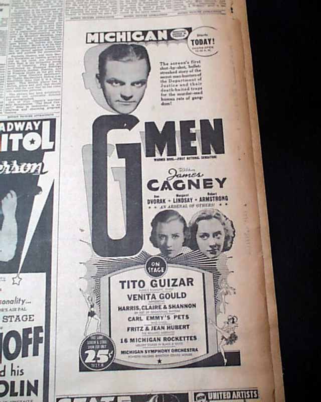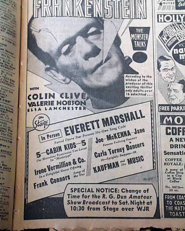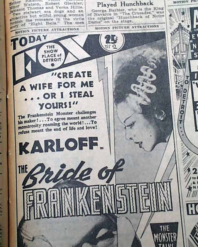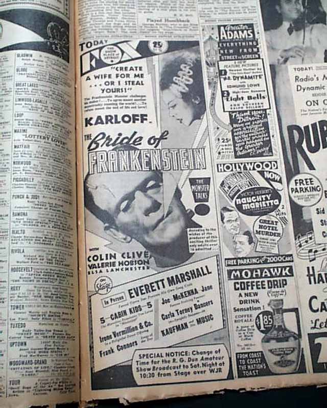 Page 15 has a illustrated advertisement for the premiere showing in Detroit for the horror film: "The Bride Of Frankenstein" starring Boris Karloff. The ad measures 10 1/2 x 4 inches. (see)