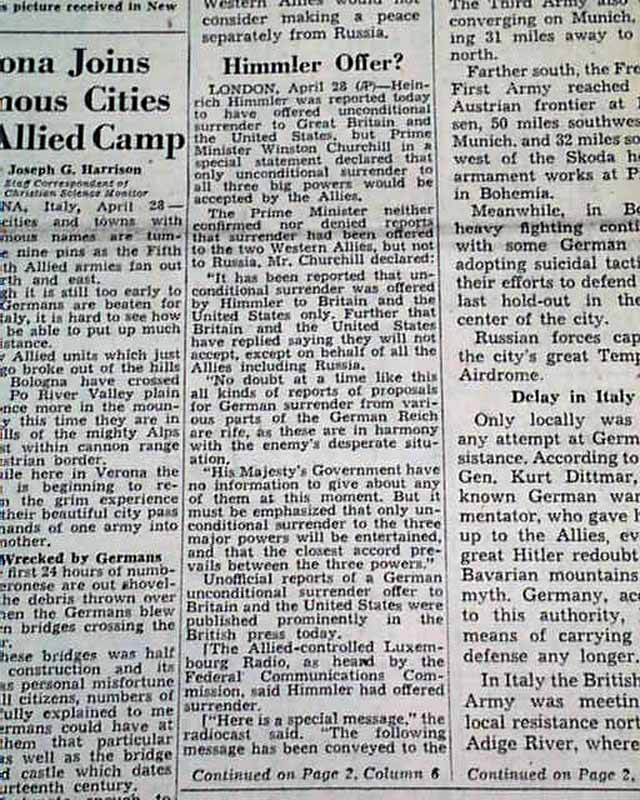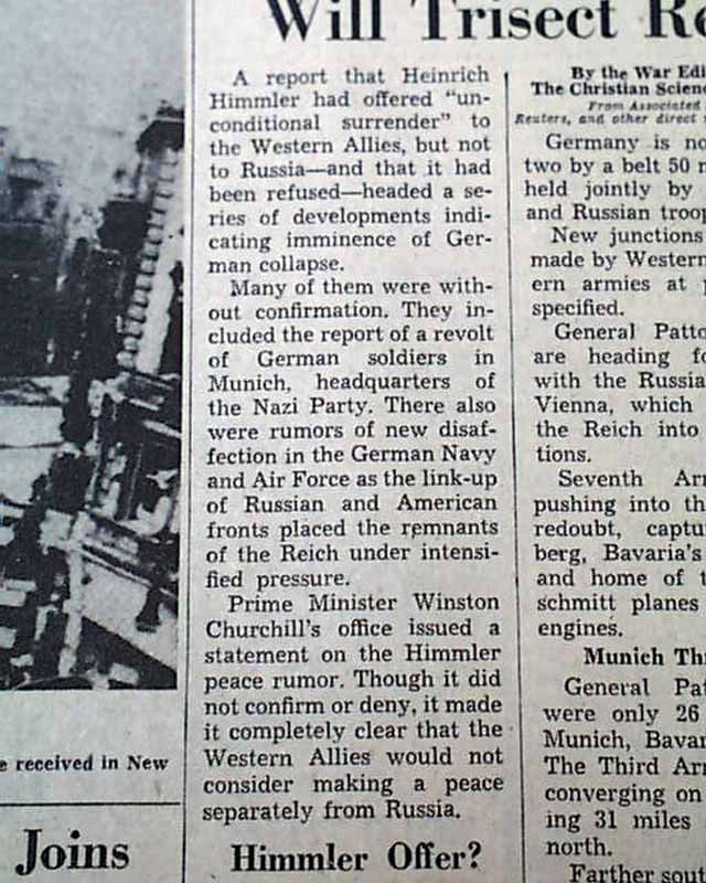 The front page has a banner headline: "Himmler Offer to Surrender Is Reported" with subhead. (see images)