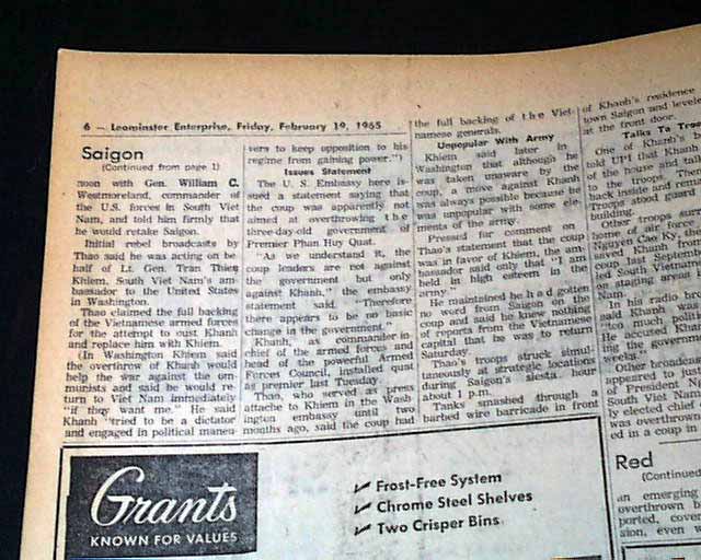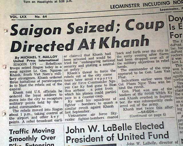 The top of the front page has a three column headline: "Saigon Seized; Coup Directed At Khanh" (see images)