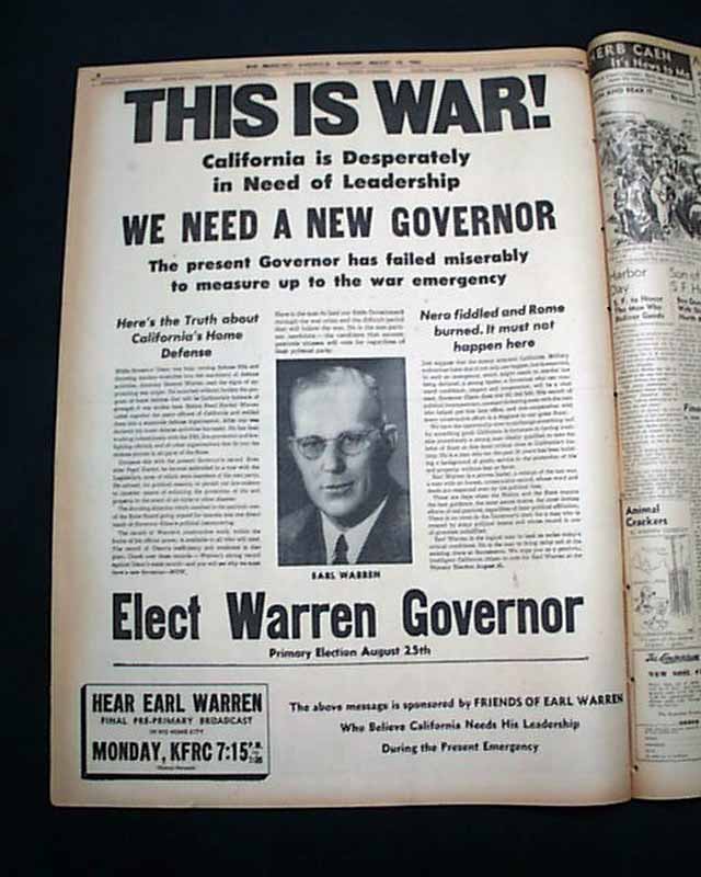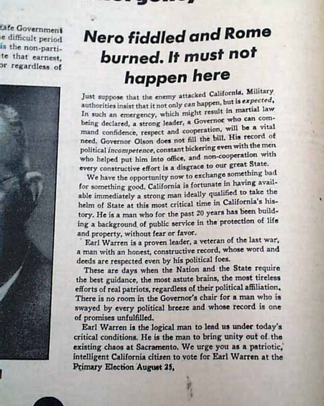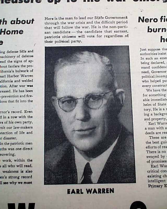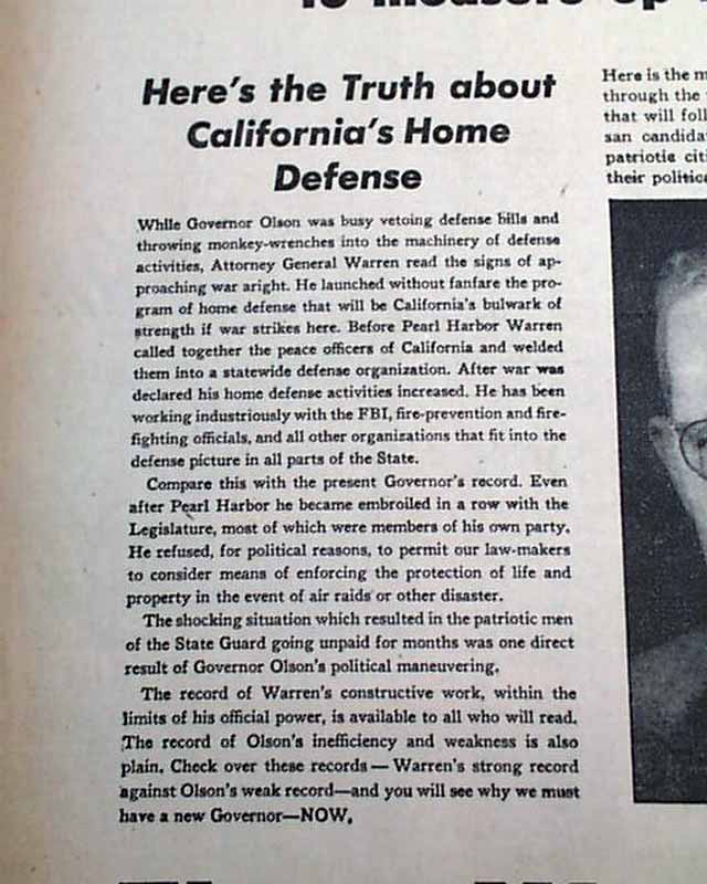 Page 8 has a great full page campaign advertisement for Earl Warren who was running for California Governor for the first time. This would propel him to become the 14th Chief Justice of the United States Supreme Court about 11 years later. Nice for display. (see images)