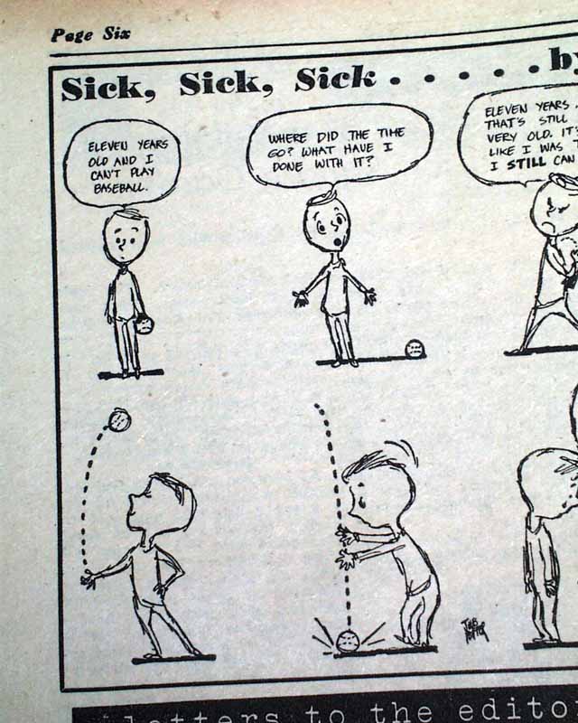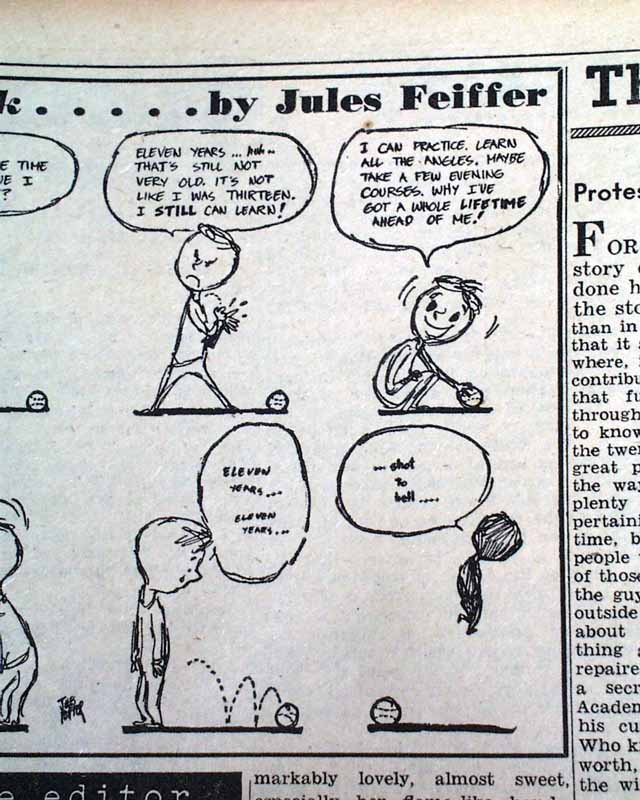 Page 6 has the second ever appearance of a Jules Feiffer cartoon headed: "Sick, Sick, Sick" (see images) Issues from the 1950's are extremely rare as the circulation of this publication was very low in it's infancy.