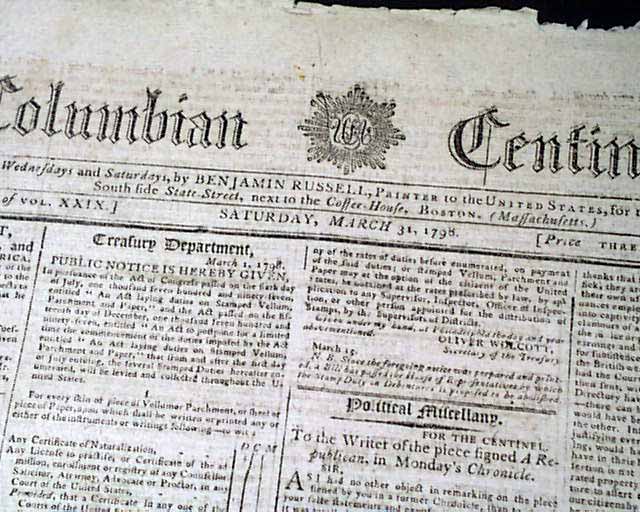COLUMBIAN CENTINEL, Boston, March 31, 1798