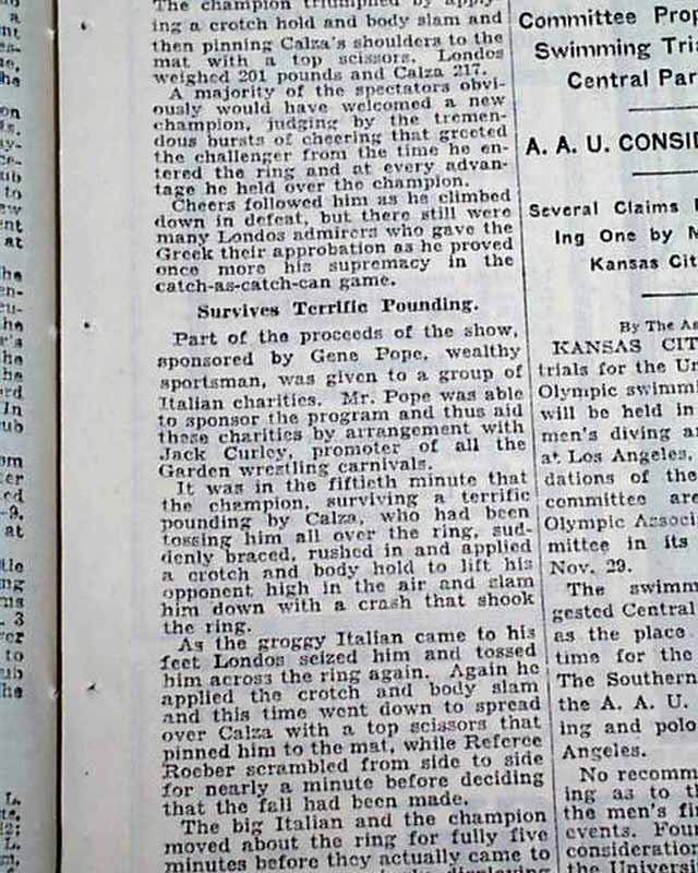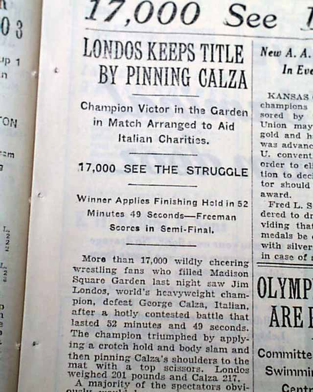 The top of page 35 has a banner heading: "17,000 See Londos Keep Wrestling Title by Defeating Calza in the Garden" with subheads. (see images)