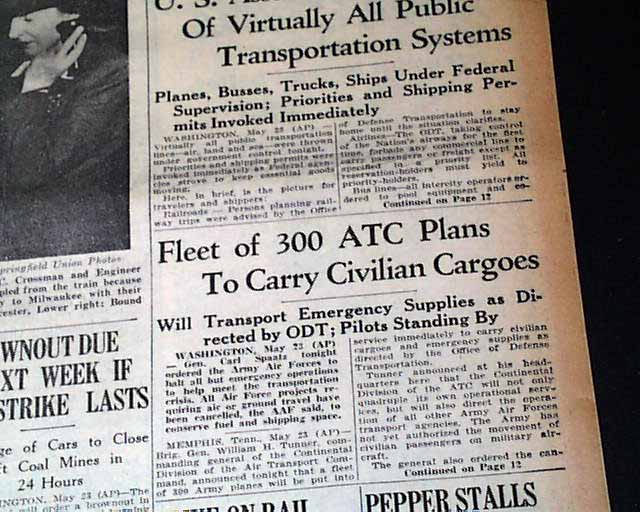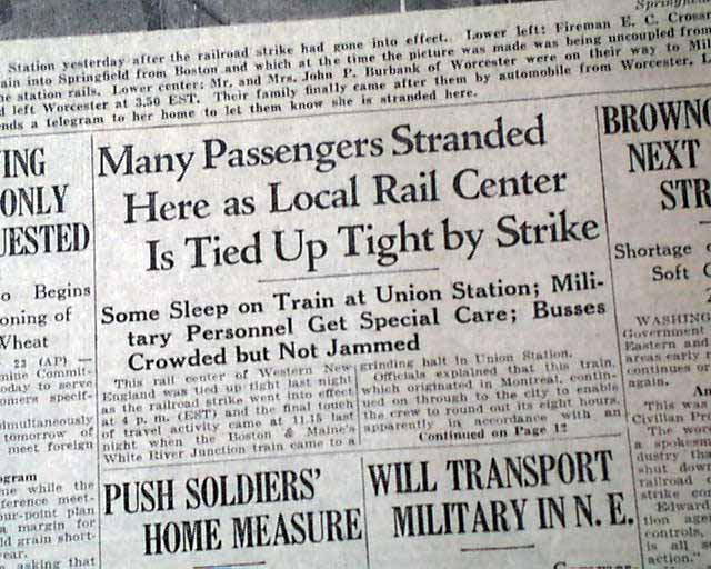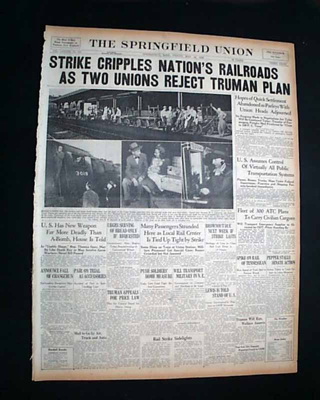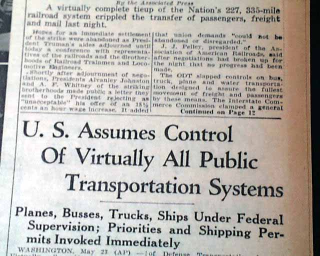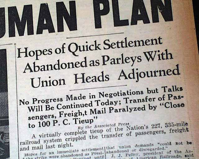 The front page has a nice banner headline: "STRIKE CRIPPLES NATION'S RAILROADS AS TWO UNIONS REJECT TRUMAN PLAN" with many subheads and related photo pictorial. (see images)