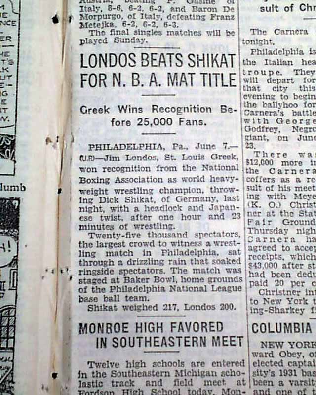 Page 13 has a somewhat discrete, brief but significant report with a one column heading: "Londos Beats Shikat For N.B.A. Title" and subhead: "Greek Wins Recognition Before 25,000 Fans" (see image)
