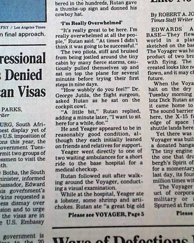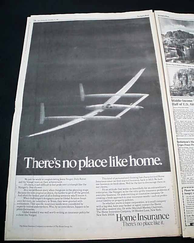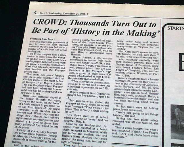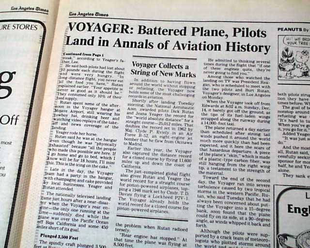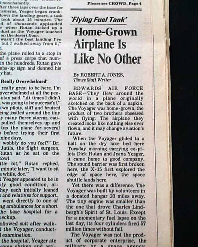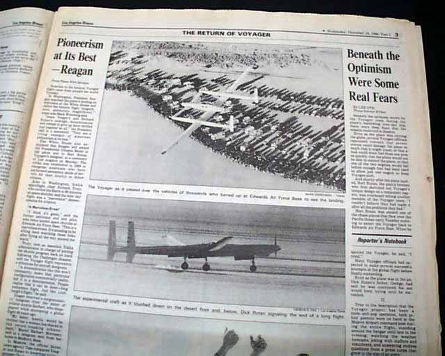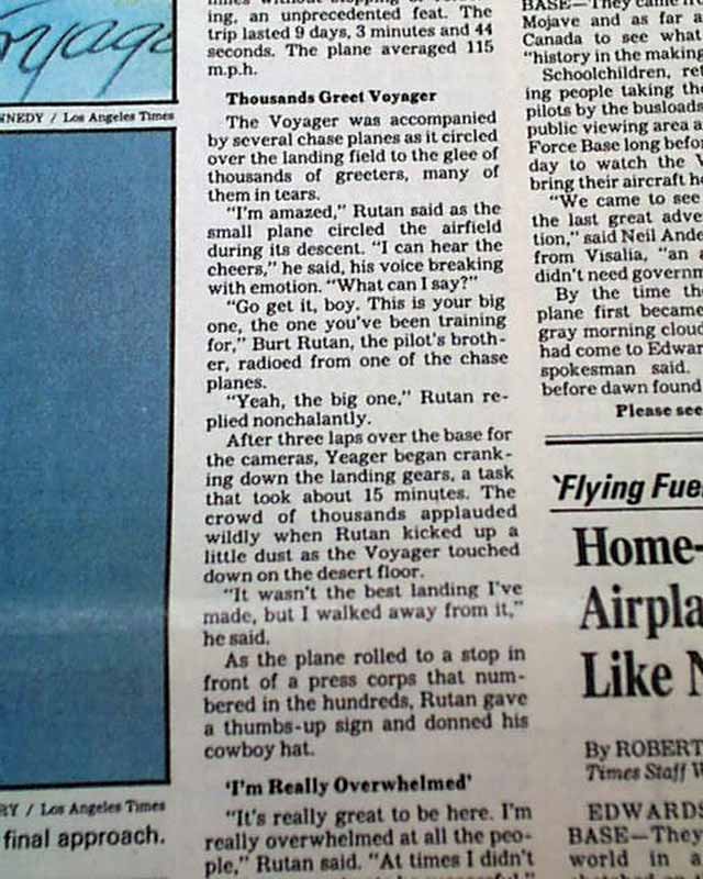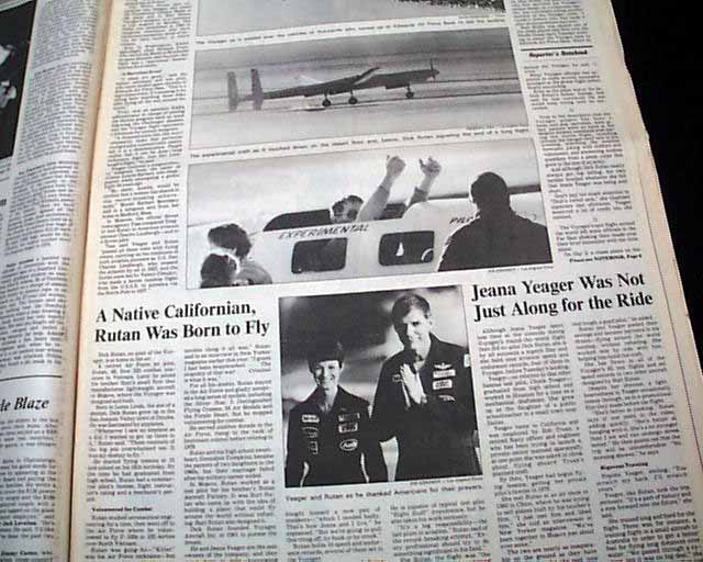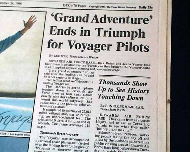 The top of the front page has a two column headline: "'Grand Adventure' Ends in Triumph for Voyager Pilots" with subheads and 2 related photos. Much more on the following pages, loads of text.