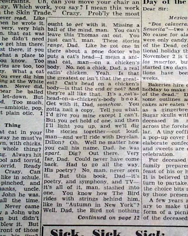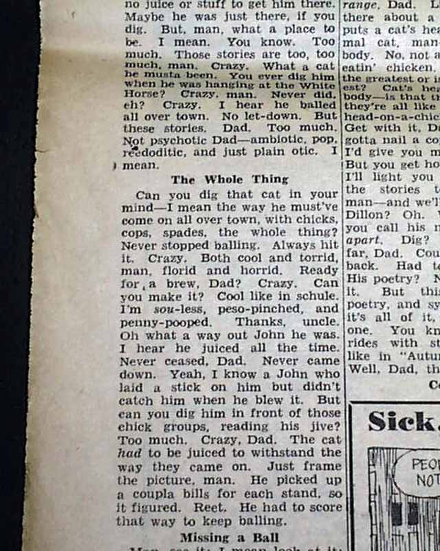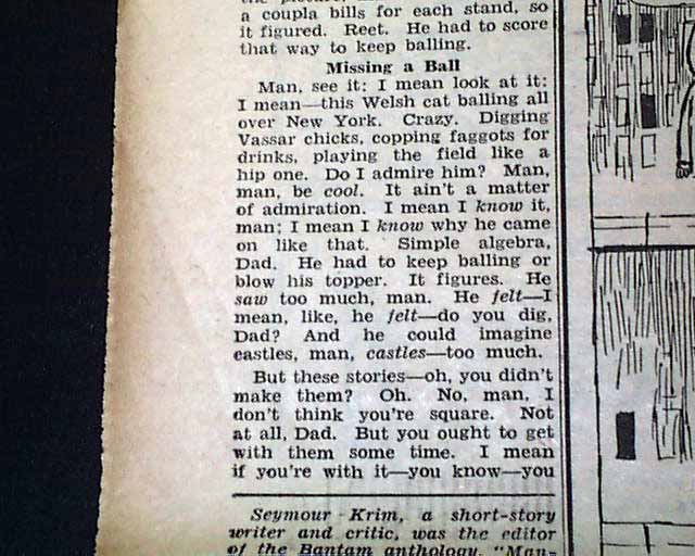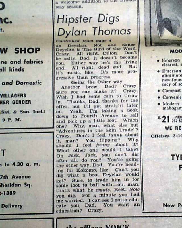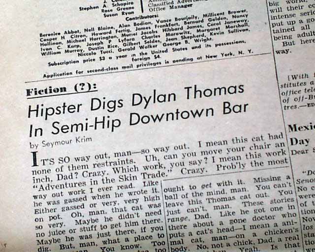 Beginning on page 4 is a editorial by Seymour Krim headed: "Hipster Digs Dylan Thomas In Semi-Hip Downtown Bar"