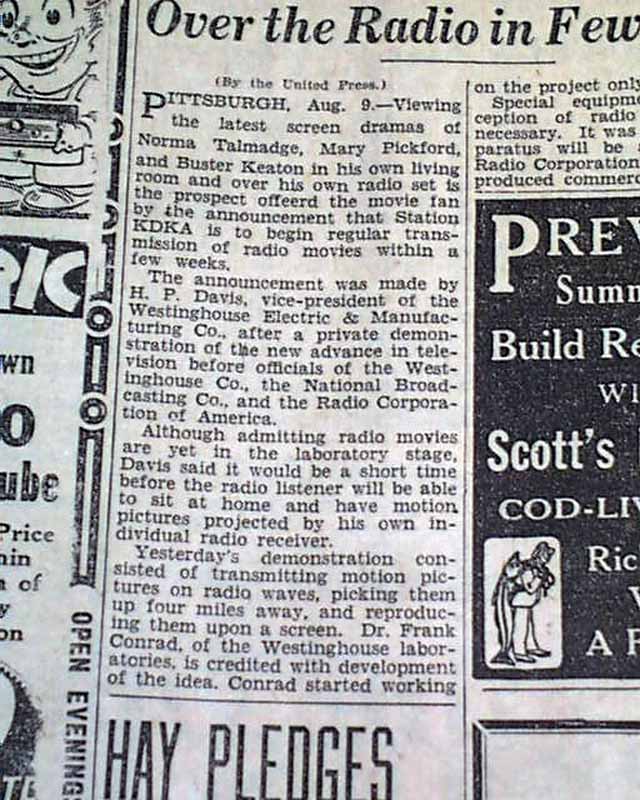 background: On August 8, 1928, the Westinghouse Electric and Manufacturing Company conducted a groundbreaking public demonstration in Pittsburgh that offered a glimpse into the future of mass media: the transmission of "radio movies," an early form of television. Utilizing their experimental station, W8XAV, engineers broadcasted moving images of a man through the air via radio waves to a receiver located miles away, where a small, flickering 6-by-6-inch screen reconstructed the silhouette-like motion. This feat relied on mechanical television technology, specifically a rapidly spinning Nipkow scanning disc that translated light into electrical impulses. While the resolution was crude and the images appeared in a ghostly neon orange hue, the event proved that visual entertainment could be synchronized with radio transmission. Orchestrated by pioneers like Dr. Frank Conrad, this demonstration was a pivotal moment in the transition from purely auditory broadcasting to the electronic visual age, signaling to the public that the "miracle" of seeing across distances was no longer a laboratory dream but a looming reality for the modern home.