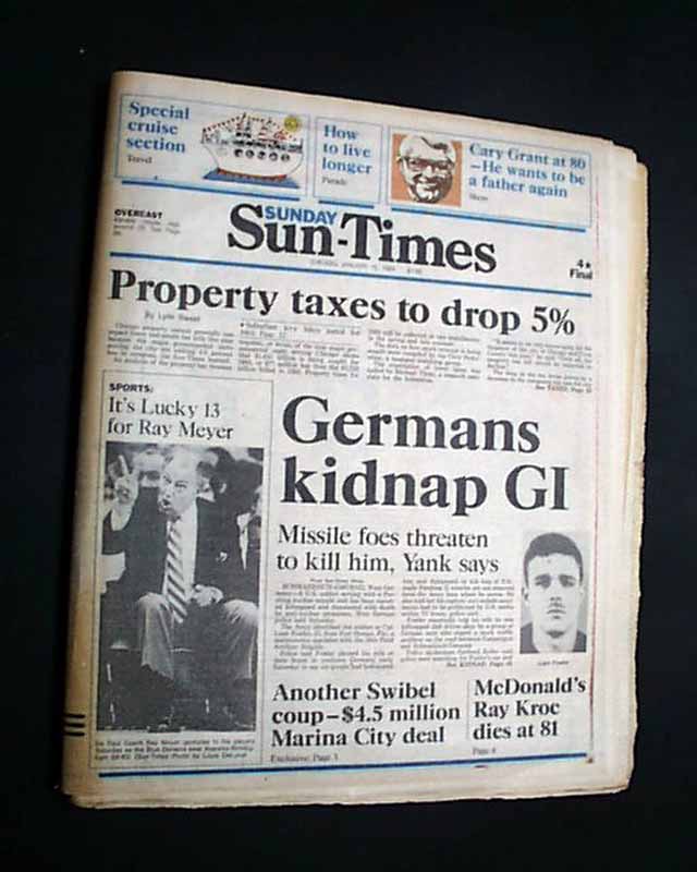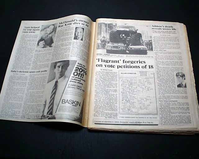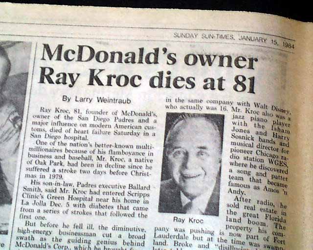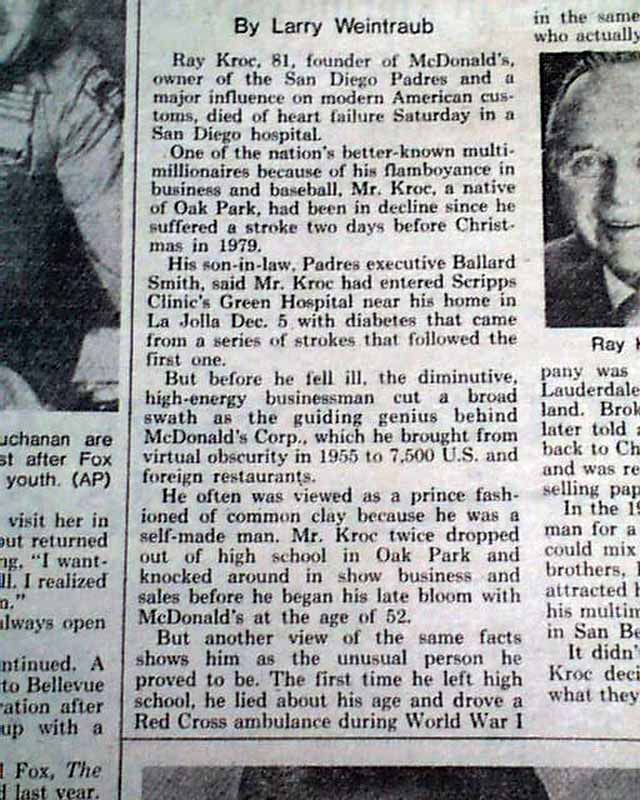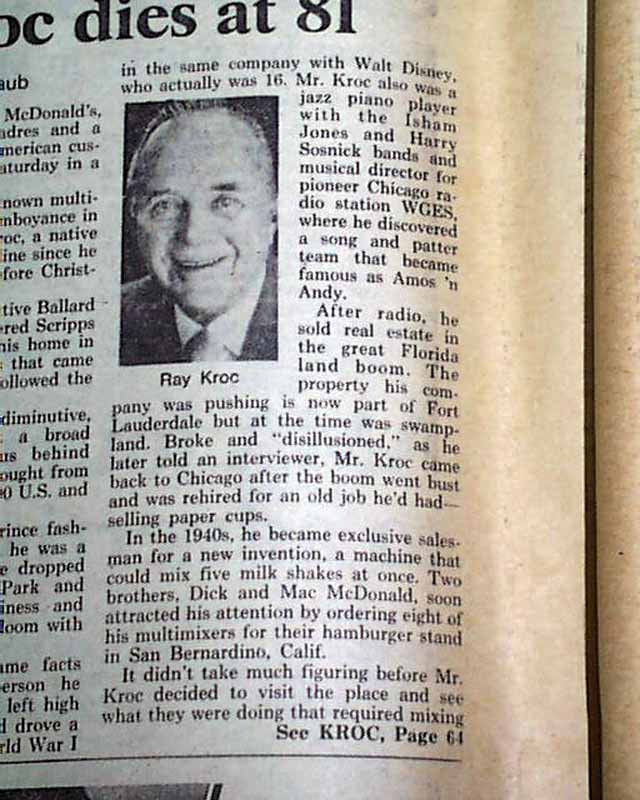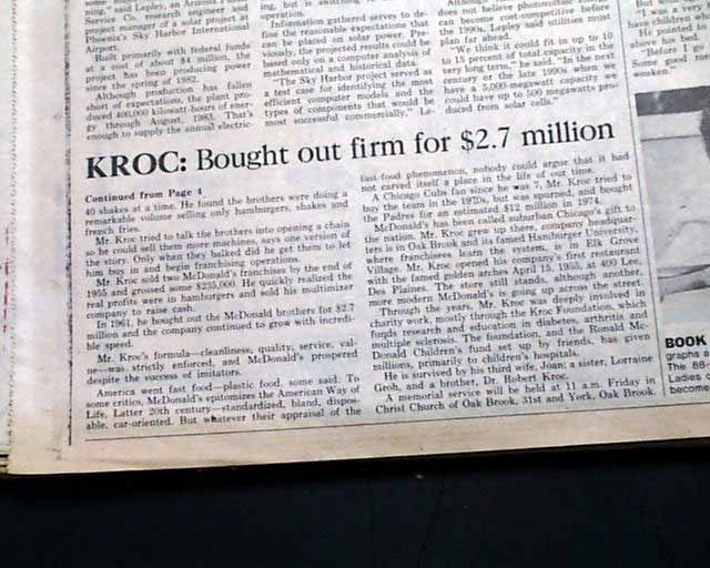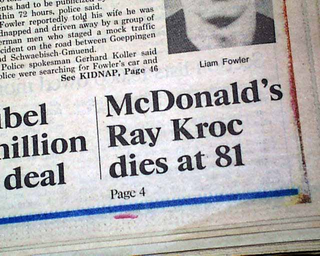 The top of page 4 has a heading that reads: "McDonald's owner Ray Kroc dies at 81" with small photo of Kroc. The bottom of the front page has a heading noting his death. (see images)