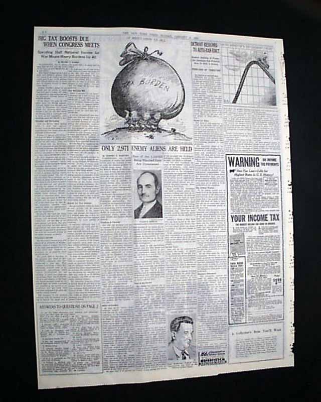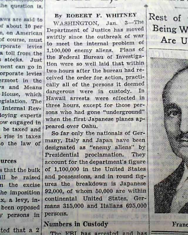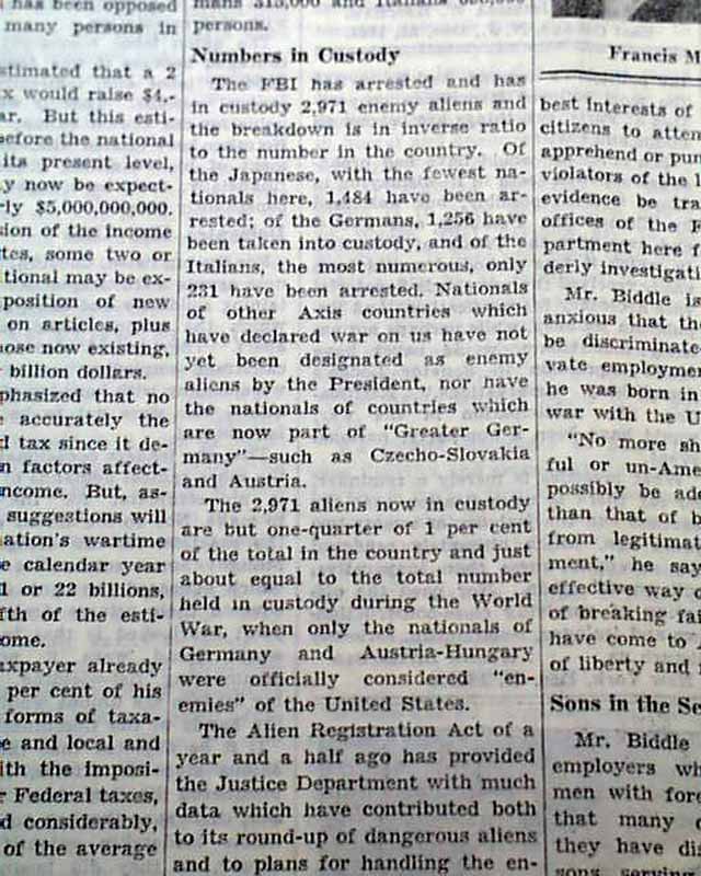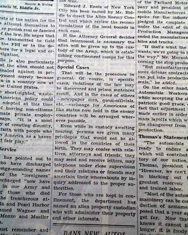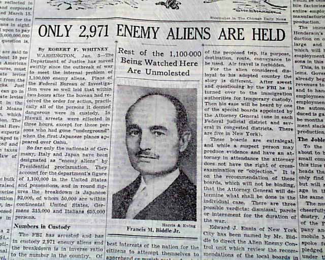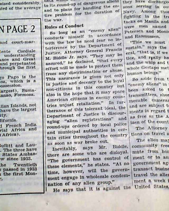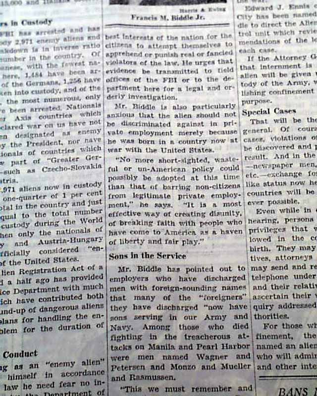The back page of this section has a editorial by Robert F. Whitney with heading: "ONLY 2,971 ENEMY ALIENS ARE HELD" with photo of Francis M. Biddle. (see images)