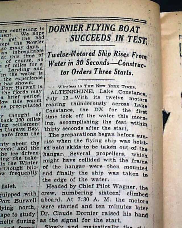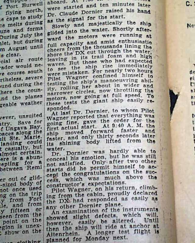 The top of page 2 has a one column heading: "Dornier Flying Boat Succeeds In Test" with subhead. (see images)