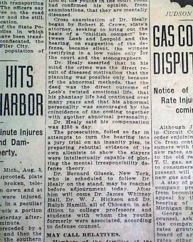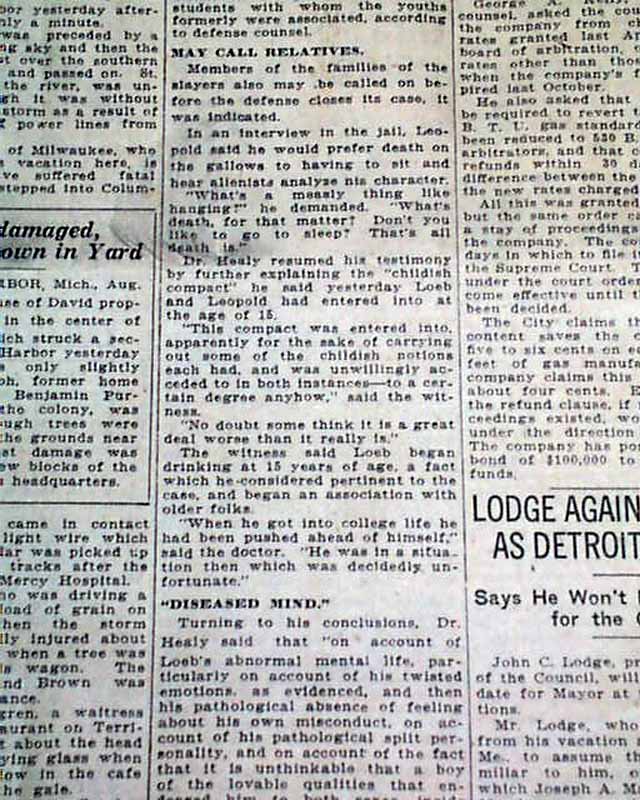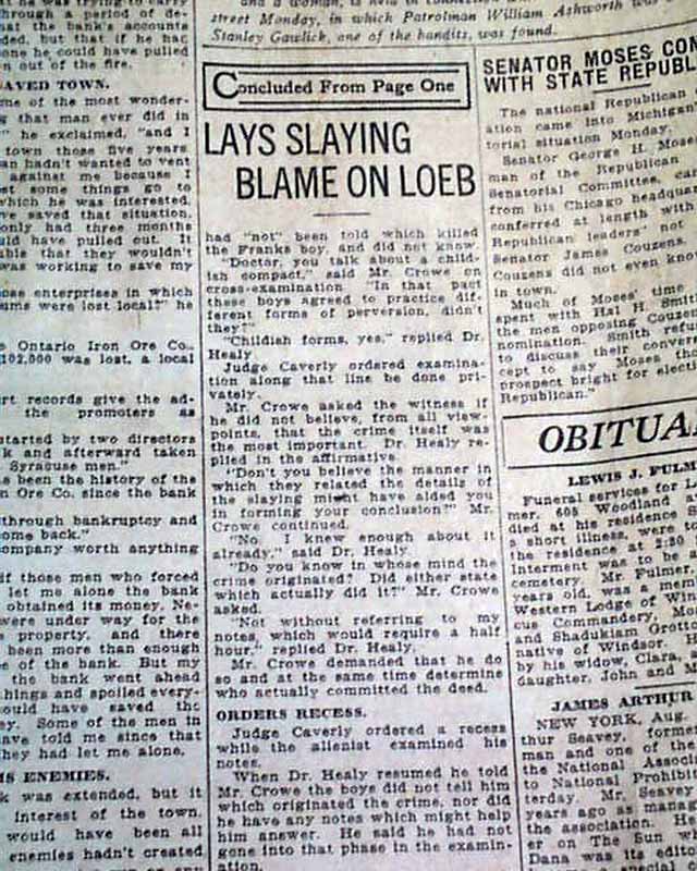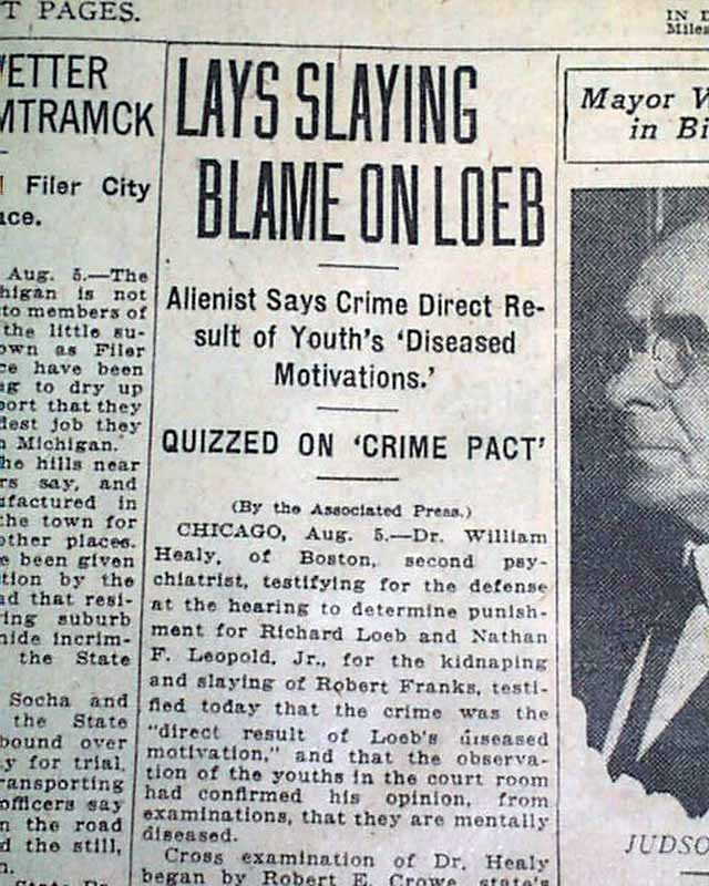 The top of the front page has a one column heading on the Leopold - Loeb case with: "LAYS SLAYING BLAME ON LOEB" with subheads. (see images)