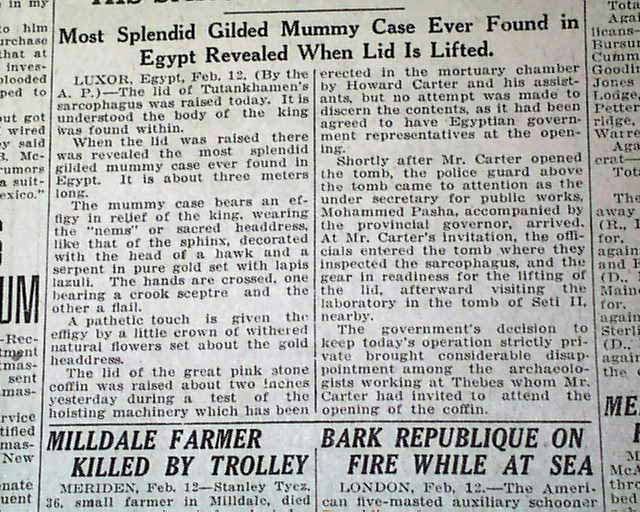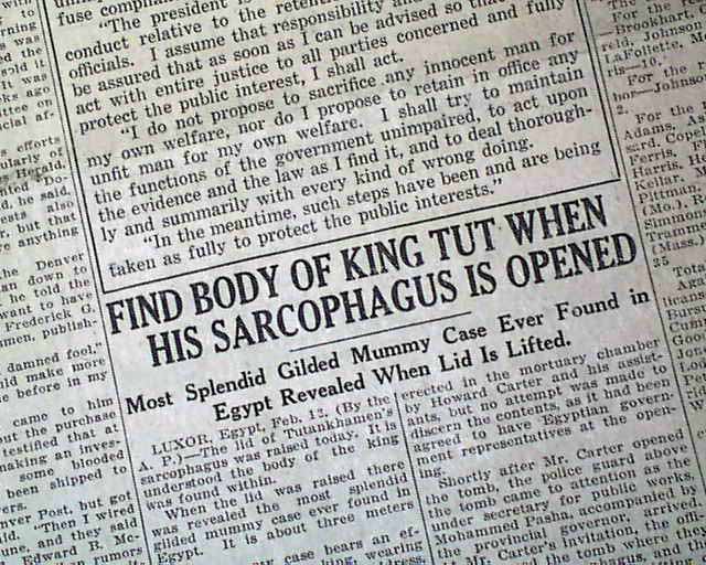 The front page has a two-column heading: "FIND BODY OF KING TUT WHEN HIS SARCOPHAGUS IS OPENED" with subhead. (see images)