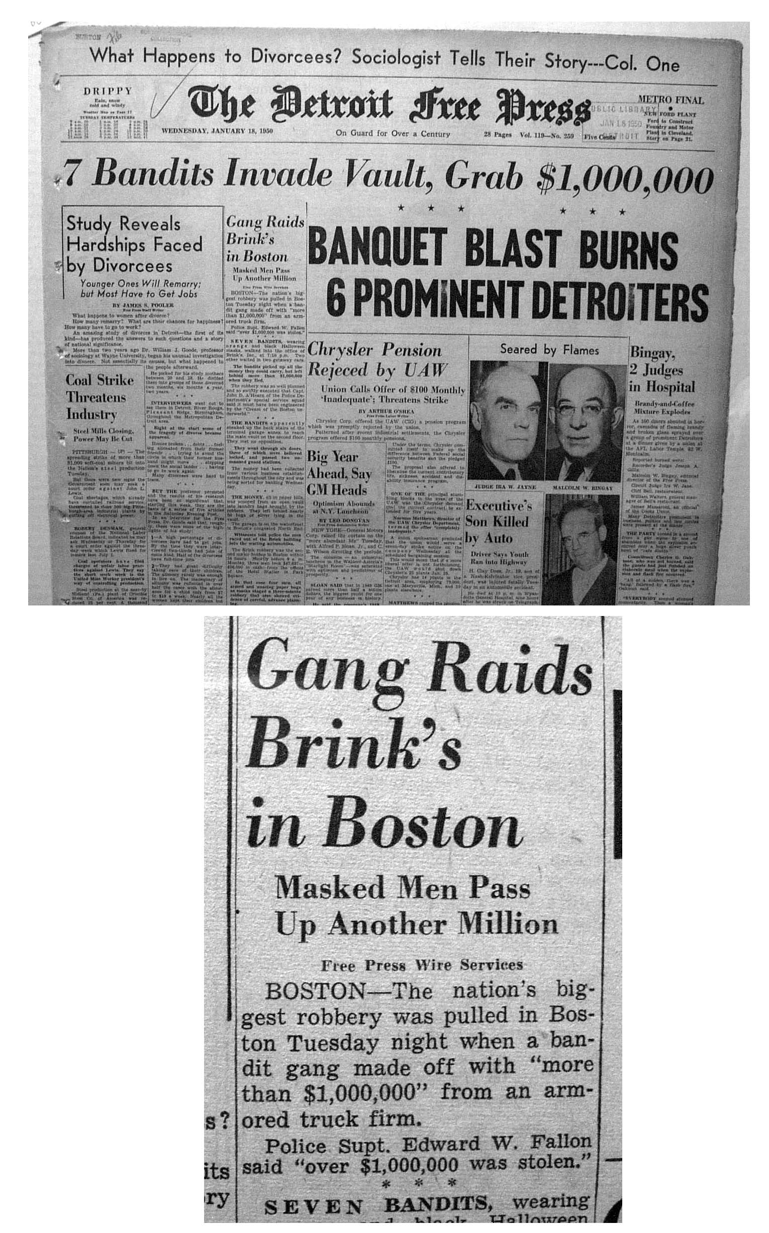 DETROIT FREE PRESS, MI Jan. 18, 1950 Banner head on the front page: "7 Bandits Invade Vault, Grab $1,000,000" Subheads: "Gang Raids Brink's in Boston" "Masked Men Pass Up Another Million". Famous robbery ! 28 pages in nice condition.