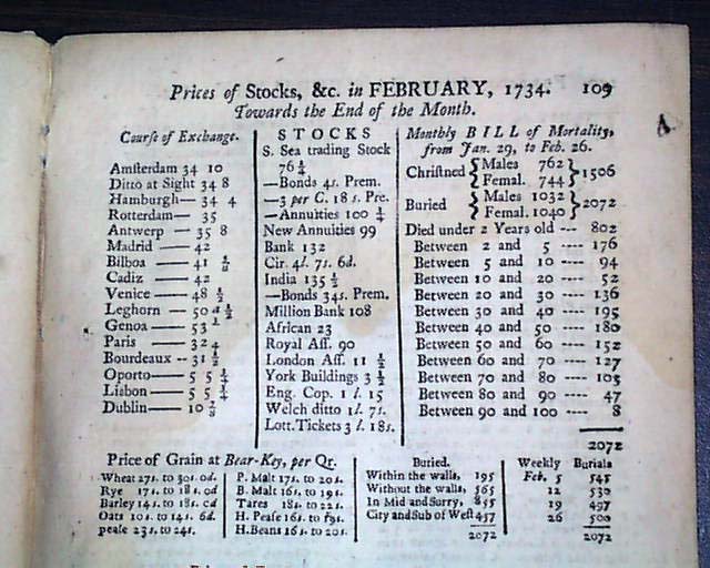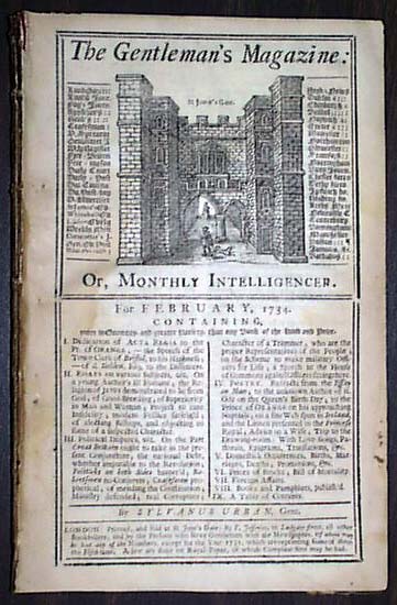 Here is a complete, genuine issue of THE GENTLEMAN'S MAGAZINE from London England. This magazine is dated: February 1, 1734 and is about 55 pages in length. The front page of this issue has a nice masthead of St. John's Gate and contains news & stories from around the world during this very early time in history. VERY INTERESTING READING from the day it was first reported including report on the constitution of England. This issue is in nice condition due to the use of cotton and rag paper used during this time in history. A nice period item form the 18th century. VINTAGE READING. WOULD MAKE A GREAT UNIQUE GIFT !
