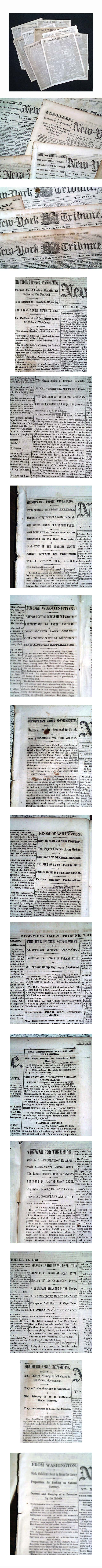 NEW YORK DAILY TRBUNE from New York, NY and dated in 1861-65. These8 page newspapers are in nice condition due to the use of cotton and rag paper during this very historic time in U.S. history. These issues are loaded with advertisements and Civil War reports throughout from the day it was first reported and much more. Nice pieces of history from these very famous newspapers. The photos below show some of the headlines that are in these issues.