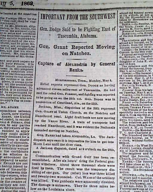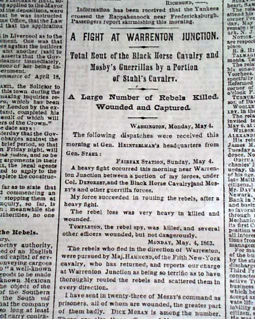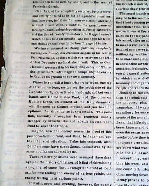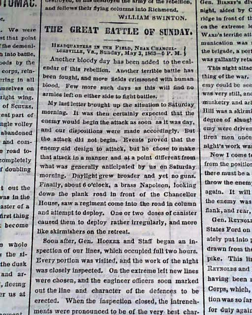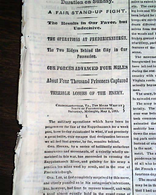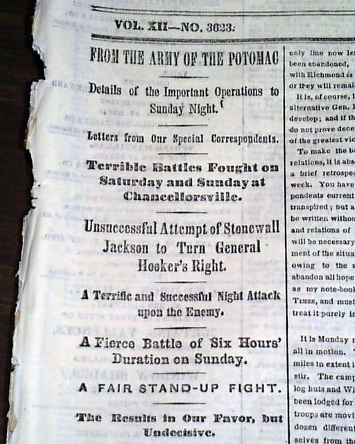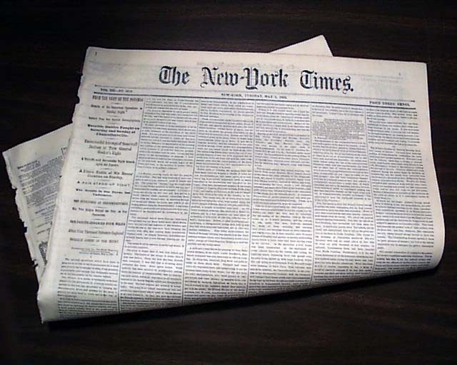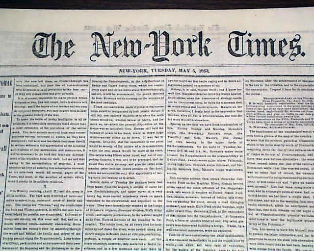 THE NEW YORK TIMES from NYC and dated May 5, 1863. This 8 page newspaper is in nice condition due to the use of cotton and rag paper during this very historic time in U.S. history. This issue is loaded with advertisements and Civil War reports throughout from the day it was first reported which includes the following headlines: "FROM THE ARMY OF THE POTOMAC" "Terrible Battles Fought on Saturday and Sunday at Chancellorsville" "Unsucessful Attempt of Stonewall Jackson to Tuen General Hooker's Right" and much more. A nice piece of history from this famous newspaper.