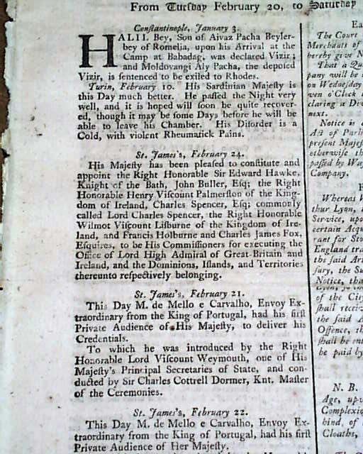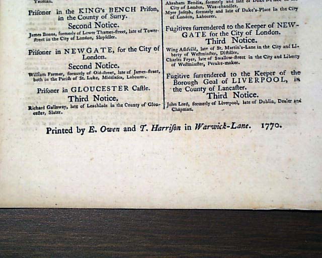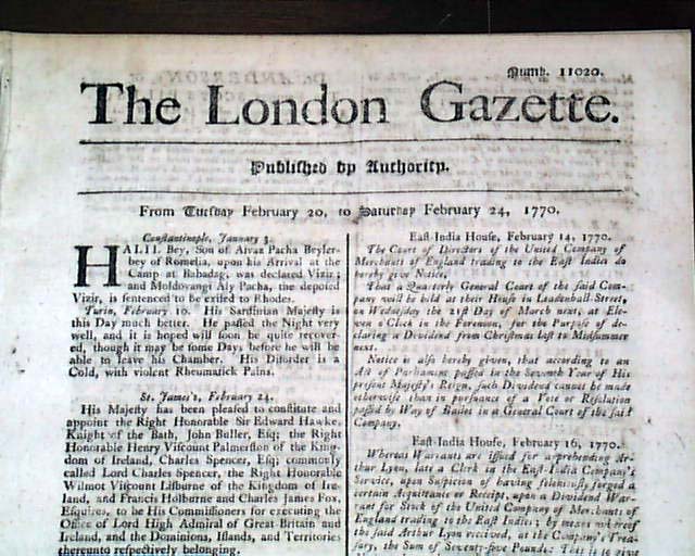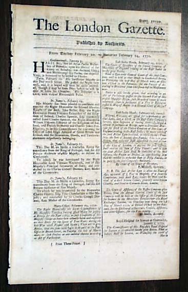 Here is the complete, genuine issue of THE LONDON GAZETTE dated February 24, 1770. This SINGLESHEET issue is 235 years old. Various news from London and other parts of Europe also with some interesting advertisements as well. A complete newspaper measuring about 7 by 11 1/2 inches and is in great condition. Made of rag paper which was used back in the day (no wood pulp). Fine and very early newspaper. Can easily be framed. WOULD MAKE A GREAT UNIQUE GIFT.