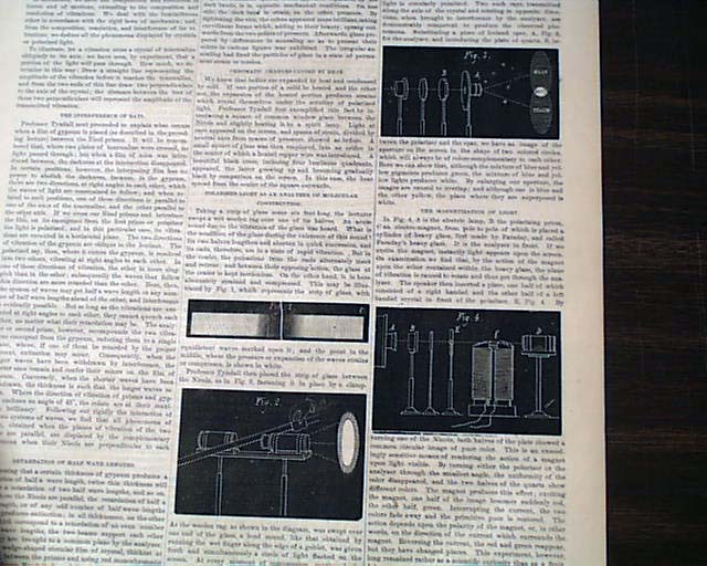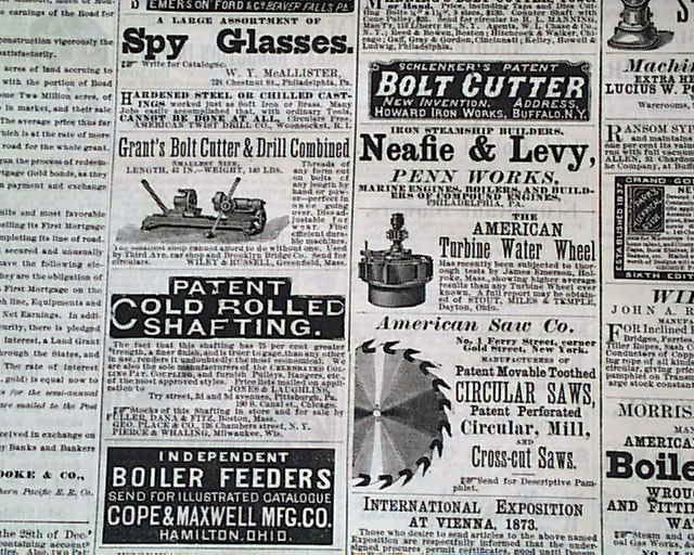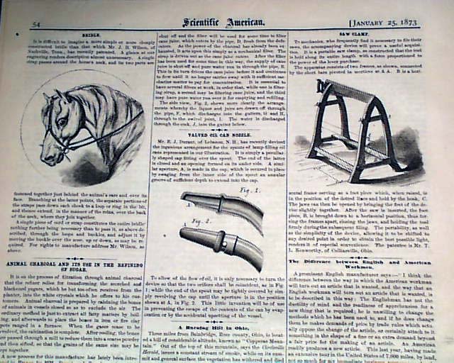 SCIENTIFIC AMERICAN New York, January 25, 1873. This 16 page issue is in nice condition and contains illustrations of the latest inventions of the day including the following inventions:  SUBMARINE DIVING APPARATUS - SUGAR FILTERING - SAW CLAMP - THREE CYLINDER ENGINE & Much More. These illustrations also have text that goes along with them. Very interesting advertisements as well, back in the day when many of the normal things we use today were just being invented. The 1870's was considered the heyday for new inventions which included the electric light bulb, phonograph, telephone & etc... VERY INTERESTING STUFF HERE. Some of the inventions seen in this magazine are unusual & comical. Nice To Frame
