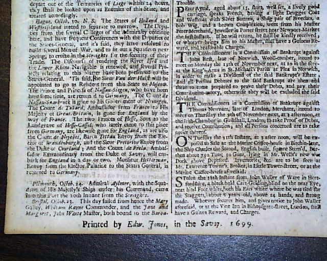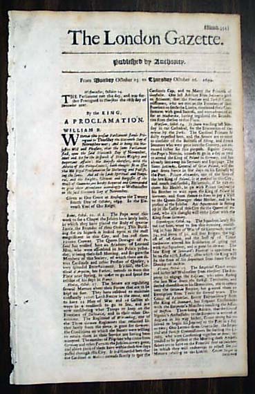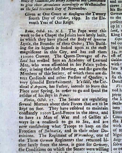 LONDON GAZETTE, Oct. 26, 1699 A front page report from "Rome" says: "The Pope went this week to see a Chapel the Jesuits have lately built, in which they have placed the Body of Ignatious Loyola, the Founder of their Order; This Building for its bigness is looked upon as the most magnificent in this City, and...cost them 120,000 Crowns." Singlesheet, nice shape.