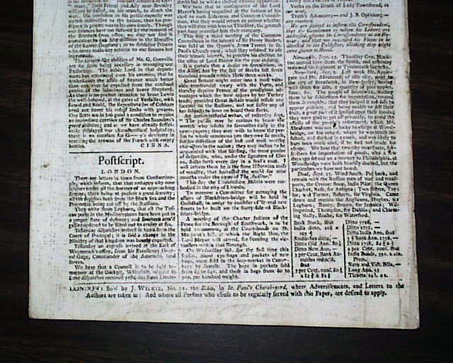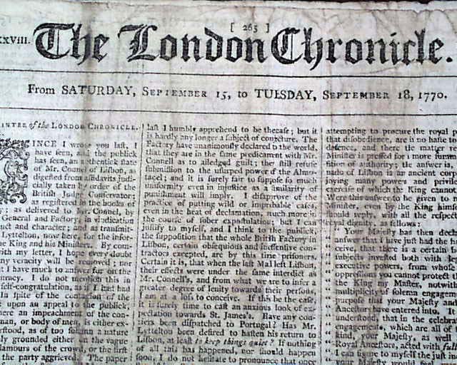Here is a complete, ABSOLUTELY GENUINE issue of THE LONDON CHRONICLE newspaper from England, dated July 19, 1770. One of the more famous newspapers of this period from shortly before the outbreak of the Revolutionary War--and from the year of the Boston Massacre--with an inside page containing the ad as seen in the photo below, headed: "AMERICAN LANDS to be sold..."in Albany County, New York, with other details noted. Other news reports and advertisements of the day as well. Complete 8 page issue, rubbing & some dirtiness to the front page, otherwise rather nice.