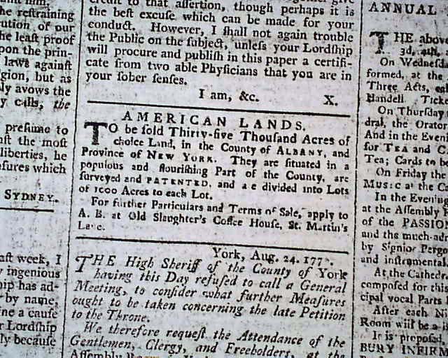 1770 London Newspaper with ALBANY LAND FOR SALE Advertisement