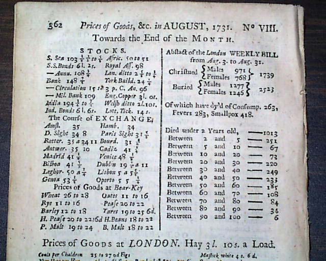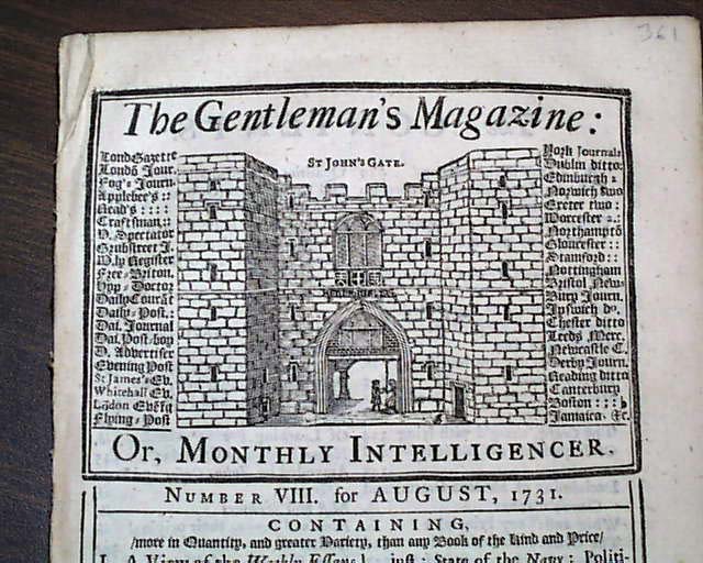 Here is a complete, genuine issue of THE GENTLEMAN'S MAGAZINE from London England. This magazine is dated: August, 1731 and is about 55 pages in length. The front page of this issue has a nice masthead of St. John's Gate and contains news & stories from around the world during this very early time in history. VERY INTERESTING READING from the day it was first reported including article on Gardening tips. This issue is in nice condition due to the use of cotton and rag paper used during this time in history. A nice period item form the 18th century. VINTAGE READING. WOULD MAKE A GREAT UNIQUE GIFT !