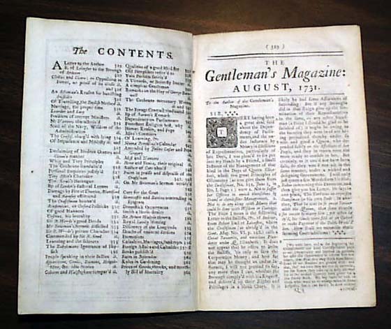 Little Background: "(1731-1914), long-popular English periodical that gave the name "magazine" to its genre. It was the first general periodical in England, founded by Edward Cave in 1731. It originated as a storehouse, or magazine, of essays and articles culled from other publications, often from books and pamphlets. Its motto-"E pluribus unum"-took note of the numerous sources scoured to assemble one monthly" Sources: Encycloprdia Britannica
