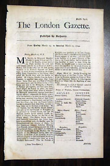 Here is the complete, genuine issue of THE LONDON GAZETTE dated March 23, 1744. This SINGLESHEET issue is 261 years old. Various news from London and other parts of Europe also with some interesting advertisements as well. A complete newspaper measuring about 7 by 11 1/2 inches and is in great condition. Made of rag paper which was used back in the day (no wood pulp). Fine and very early newspaper. Can easily be framed. WOULD MAKE A GREAT UNIQUE GIFT.