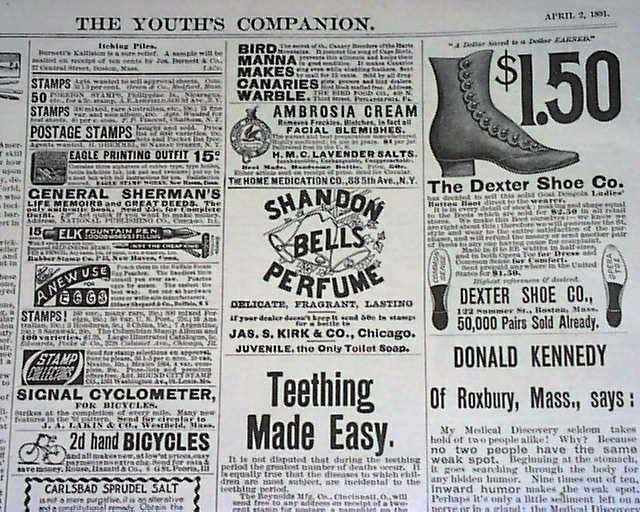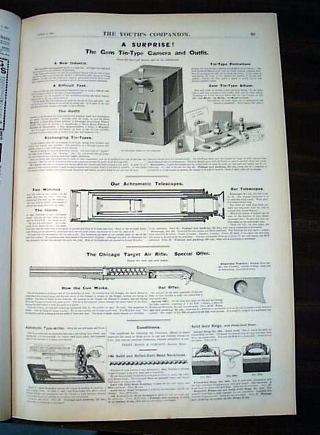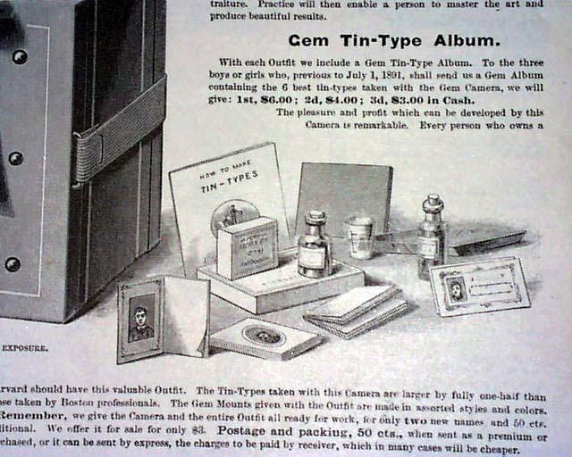 THE YOUTH'S COMPANION, Boston, April 2, 1891 Neart the back is a nearly half page promotion for "The Gem Tin-Type Camera and Outfit" which includes a nice photo of it as well as the other material required in the processing of tin types (see photo). Various text as well. You get the complete 12 page issue which is in very nice condition. Great issue for any camera buff.