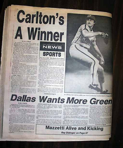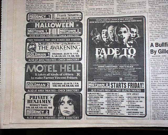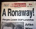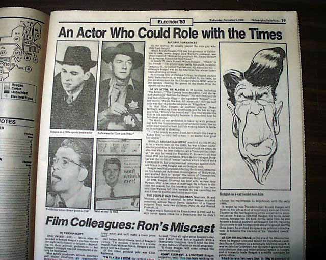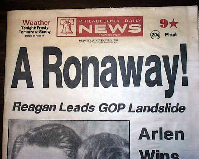 PHILADELPHIA DAILY NEWS, PA November 5, 1980. This 88 page newspaper has a nice, unusual front page headline: "A Ronaway" with banner subhead: "Reagan Leads GOP Landslide" and a photo of Reagan being kissed by his daughter. Plenty of inside page headlines and photos as well. Nice condition.
