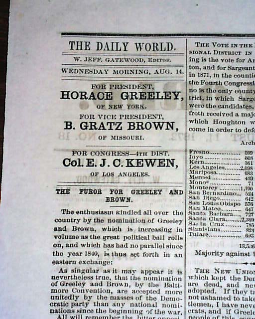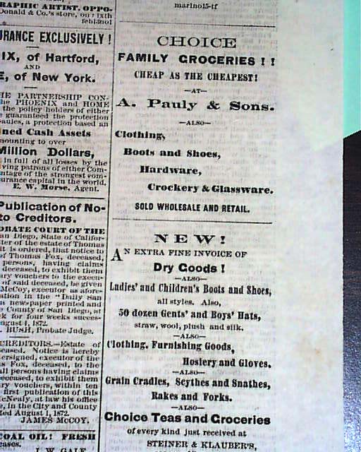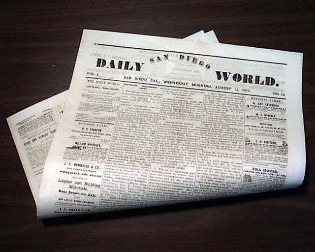 DAILY SAN DIEGO WORLD, San Diego, CA, August 14, 1872 . This 4 page volume 1 newspaper has news of the day with several interesting advertisements. With newspapers West of the Mississippi being very rare prior to 1900, here is an opportunity to get a issue from the old West back when cowboys, indians, saloons, gold miners & gunfights were often seen on a regular basis. Very early for California. Nice condition.