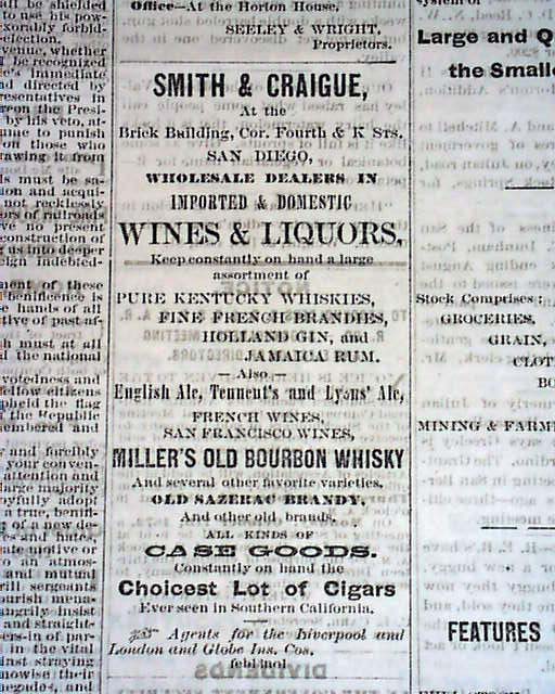 1872 Old West Newspaper From SAN DIEGO CA...