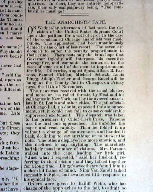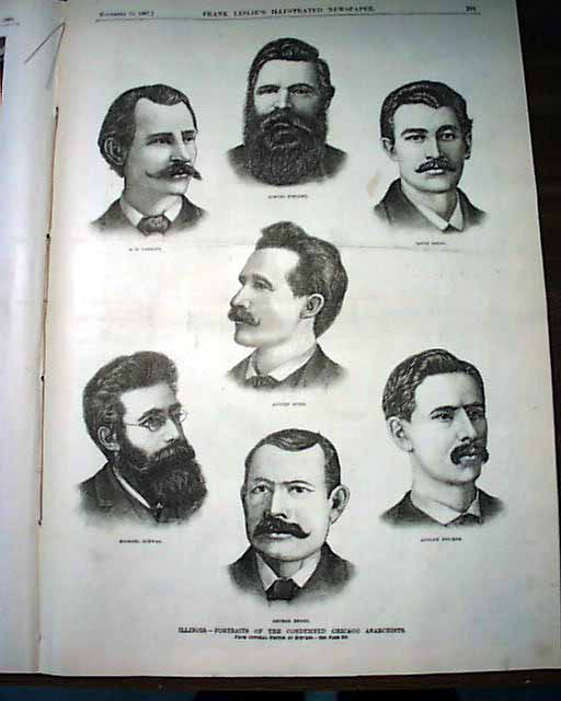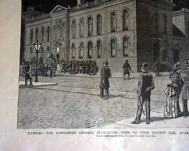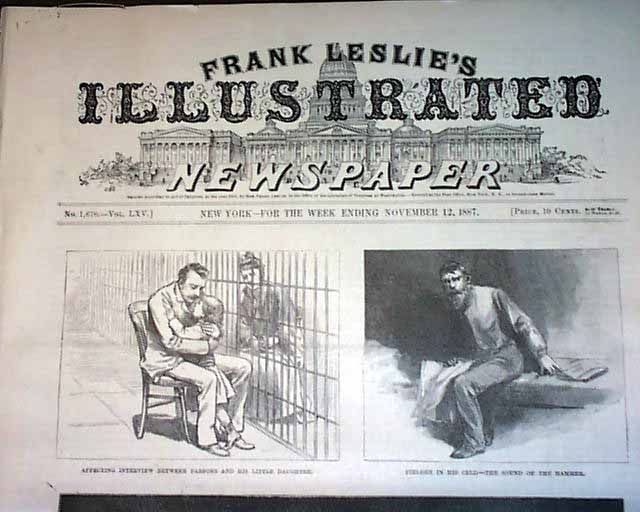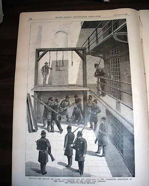 LESLIES ILLUSTRATED, N.Y., Nov. 12, 1887 Front page has 3 illustrations, the largest showing a view of Cook County jail guarded by policemen, and two of the anarchists in their jail cells. Full page print inside shows workers assembling the gallows in the north corridor of the jail where the anarchists would be executed, plus a fullpg. with portraits of the condemned Chicago anarchists. 16 pages in good condition.