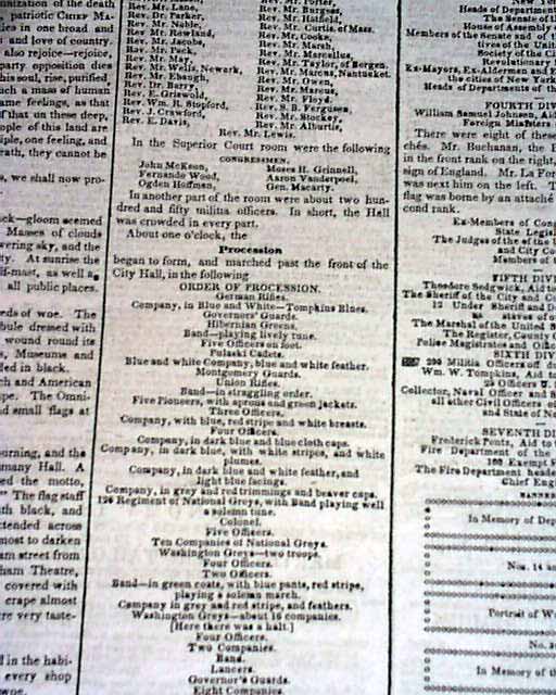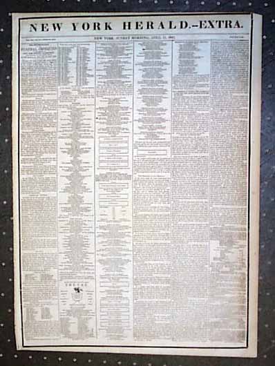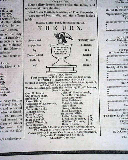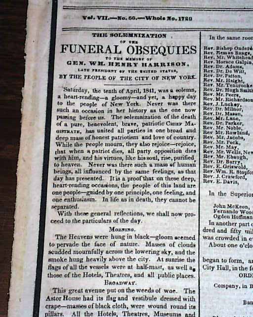 NEW YORK HERALD EXTRA, April 11, 1841The front page of this singlesheet extra has: The Solemnization Of The Funeral Obsequies To The Memory Of Gen. Wm. Henry Harrison, Late President Of The United States, By The People Of The City Of New York. Has particulars of the day and the funeral procession which includes a small illus. of The Urn. Takes 4 1/8 columns. Perimeter of the front page is black-bordered. Has all ads on the reverse. Rare Singlesheet extra in good condition.
