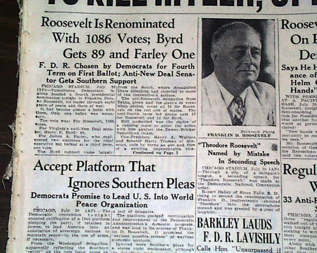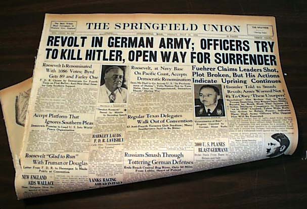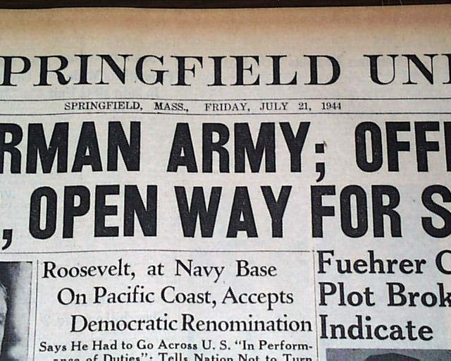 THE SPRINGFIELD UNION, Mass. July 21, 1944. This 22 page newspaper has a nice two line banner headline on the front page: "REVOLT IN GERMAN ARMY; OFFICERS TRY TO KILL HITLER, OPEN WAY FOR SURRENDER" with subheads that include: "Fuehrer Claims Leaders Shot, Plot Broken, But His Actions Indicate Uprising Continues" plus a one column photo of Adolph Hitler. Other news of the day throughout with loads of advertisments. Little wear around the margins, otherwise in good condition.