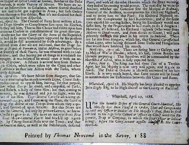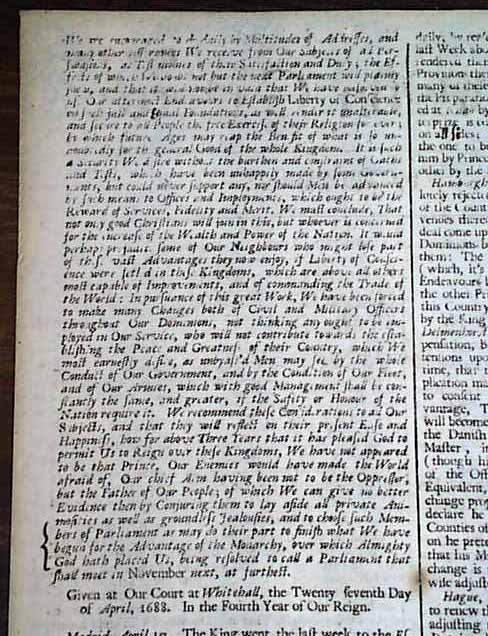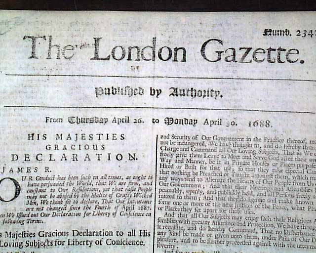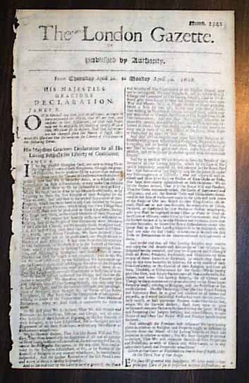 THE LONDON GAZETTE, April 30, 1688 This issue has the text of the second Declaration of Indulgence issued by King James II on April 28, 1788 (introduction is shown in the inset). Interestingly enough, this second Declaration contains the full text of the first Declaration of Indulgence (issued April 4, 1687) for Liberty of Conscience (see inset), which takes most of the front page. At the bottom of the second column is the beginning of the text for the second Declaration of Indulgence, which begins: Ever since we granted this Indulgence, We have made it Our principal Care to see it preserved without Distinction..., and concludes on page 2. The first Declaration basically granted religious freedom to the people of England, while the second Declaration stated that the intentions of the first had not changed. A singlesheet, the reverse has a few ink notations, a few small foxing spots, otherwise in very good condition.
