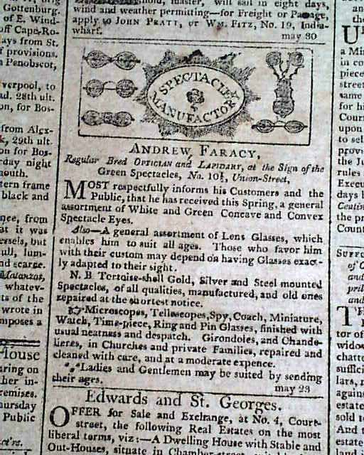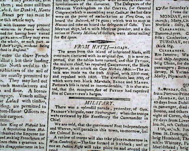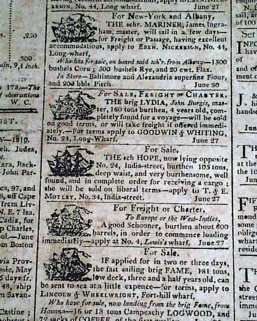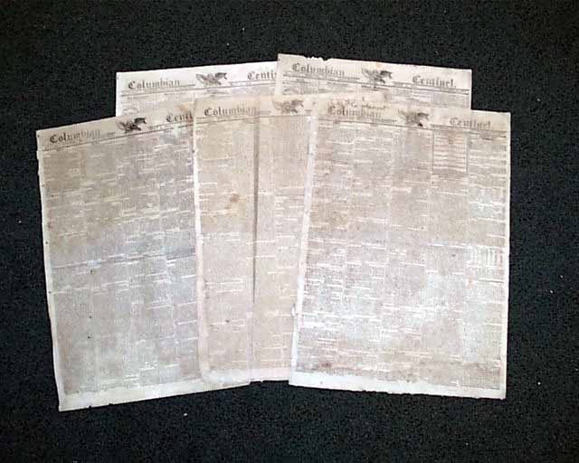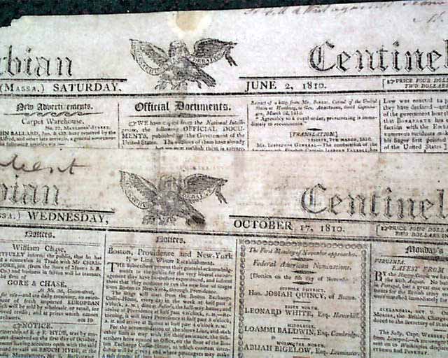 COLUMBIAN CENTINEL 5 newspapers from Boston all from the year 1810 with dates being May 19, June 2, July 4 & 25, and Oct. 17. Each issue is complete in 4 pages, folio size, with a wealth of various news reports of the day both local & national, and a great number of advertisements as well, some of which are illustrated. There is some light damp staining, some minor tears at margins, some wrinkling, and some a bit irregular at the spine. Generally a good group of issues from this very early year, two years before the breakout of the War of 1812. Each issue also has an engraving of a heraldic eagle in the masthead.