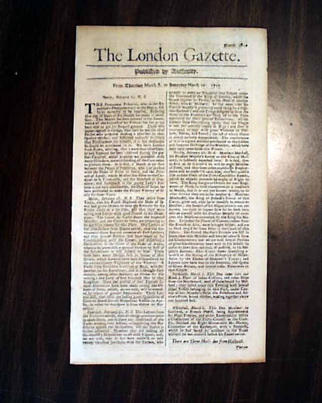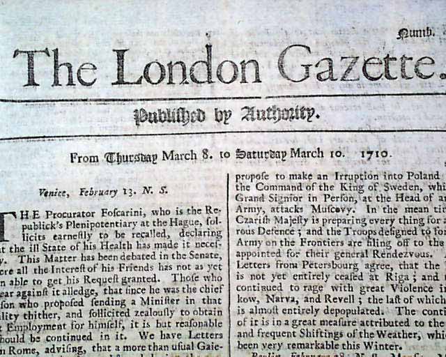 Here is the complete, genuine issue of THE LONDON GAZETTE dated March 10, 1710. This SINGLESHEET issue is 296 years old. Various news from London and other parts of Europe including: Venice, Milan, Berlin, Whitehall and more. Also has some interesting advertisements as well. This title is the oldest continuously published newspaper in the world which began in 1665 and is still in existence today. A complete newspaper measuring about 7 by 11 1/2 inches and is in great condition. Made of rag paper which was used back in the day (no wood pulp). Fine and very early newspaper. Can easily be framed. WOULD MAKE A GREAT UNIQUE GIFT.