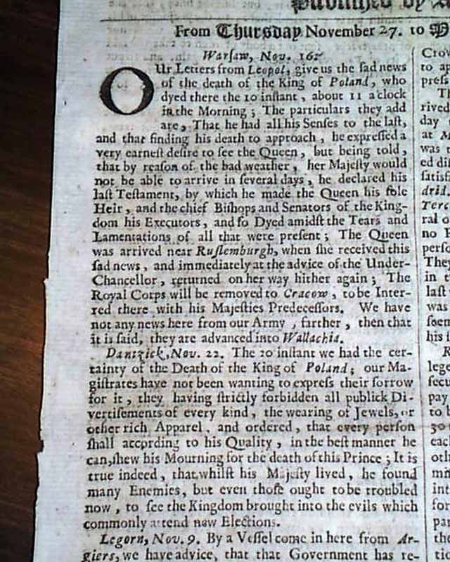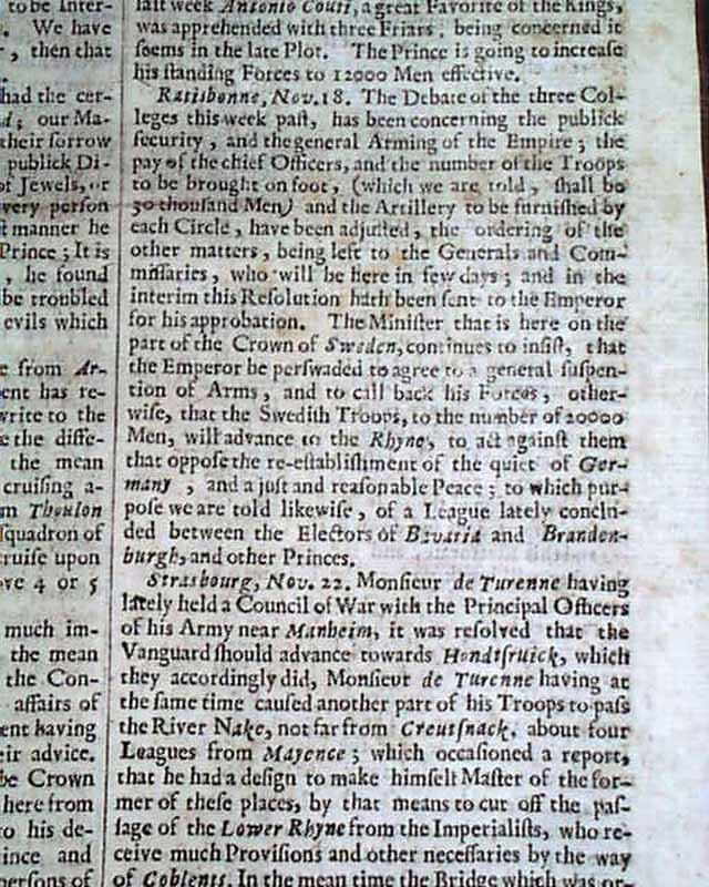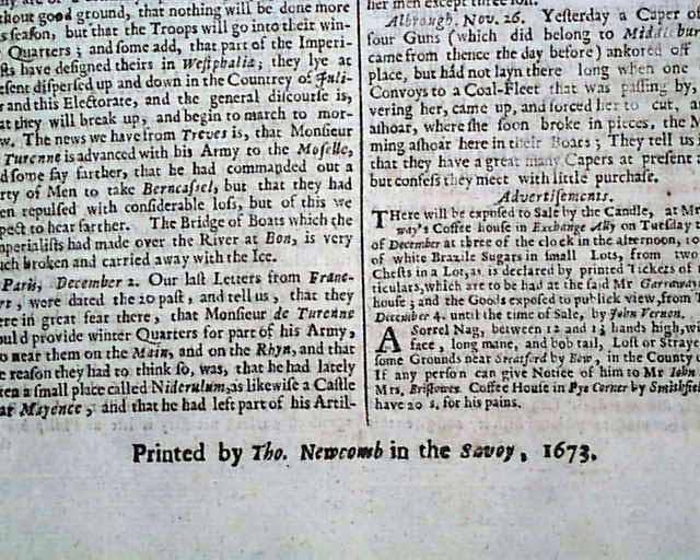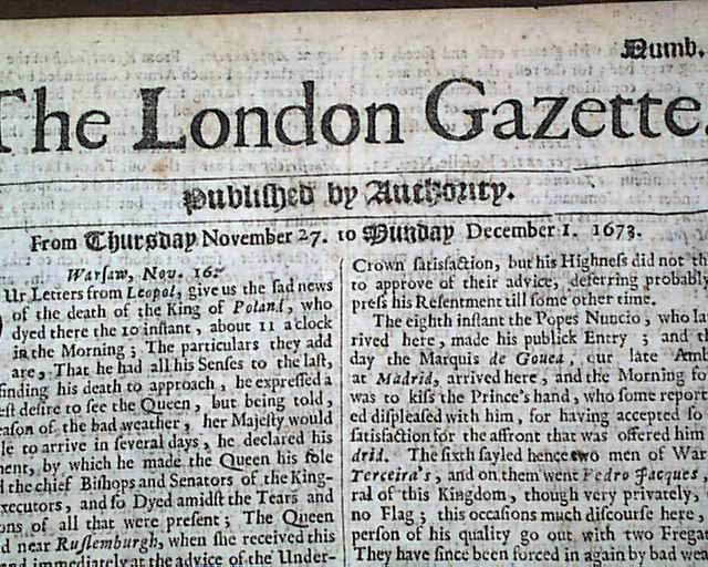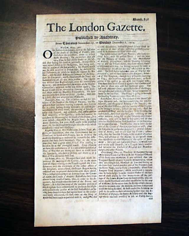 Here is the complete, genuine issue of THE LONDON GAZETTE dated December 1, 1673. This SINGLESHEET issue is 334 years old. Various news from London and other parts of Europe such as: Milan, Warsaw, Vienna, Paris and more. Also with some interesting advertisements as well. This title is the oldest continuously published newspaper in the world which began in 1665 and is still in existence today. A complete newspaper measuring about 7 by 11 1/2 inches and is in great condition. Made of rag paper which was used back in the day (no wood pulp). Fine and very early newspaper. Can easily be framed. WOULD MAKE A GREAT UNIQUE GIFT.