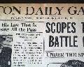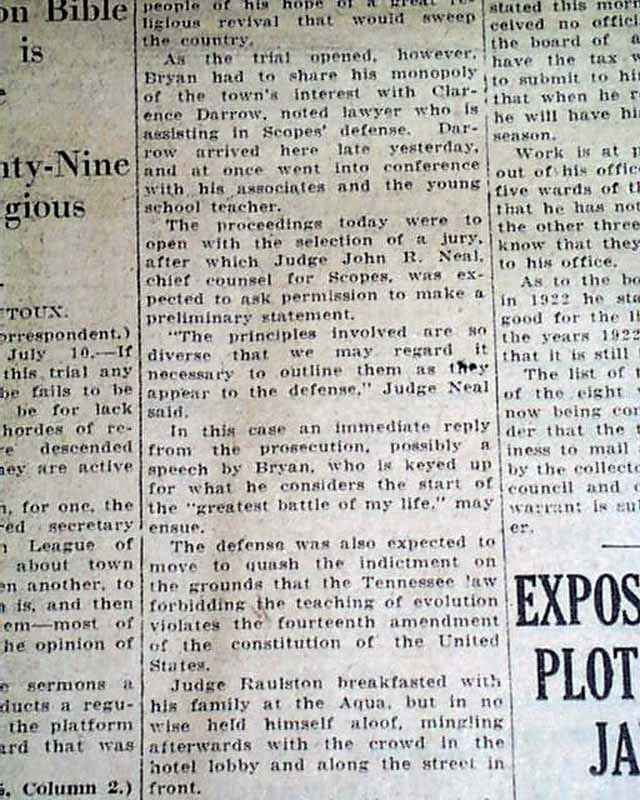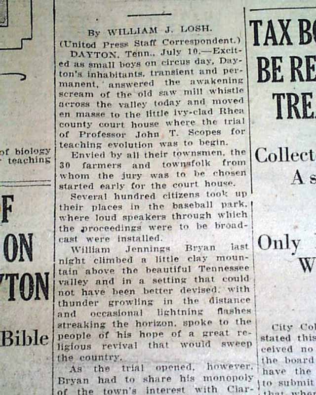 TAUNTON DAILY GAZETTE, MA, July 10, 1925. This 16 page newspaper has a nice two line, four column headline on the front page: "SCOPES TRIAL OPENS TODAY BATTLE OF EVOLUTION IS ON" with subheads that include: "Throng That Overflowed Rhea County Court House on Hand to Enjoy Battle of the Century". Tells of the beginning of the famous Scopes monkey trial. Other news of the day with several interesting advertisements throughout. Some wear at the margins and somewhat pulpish.
