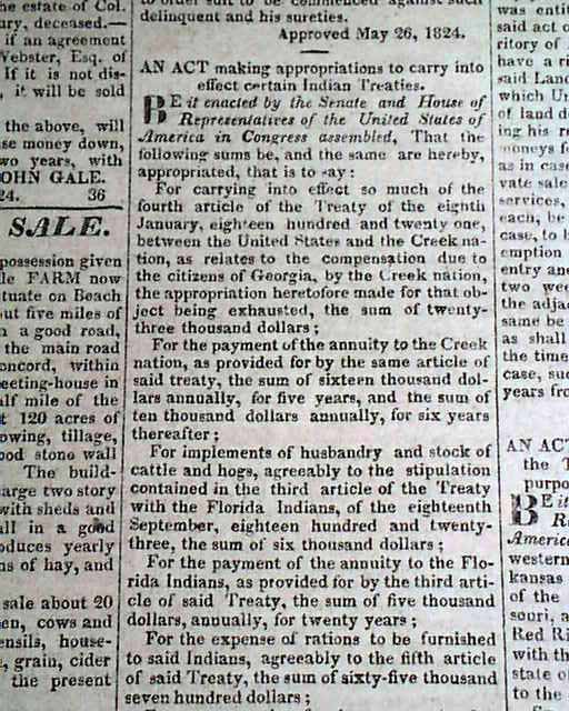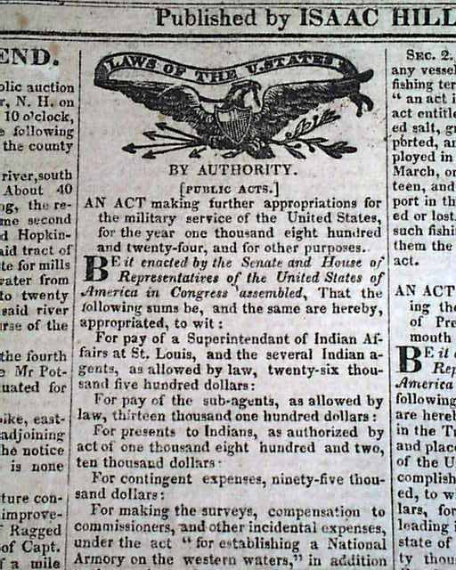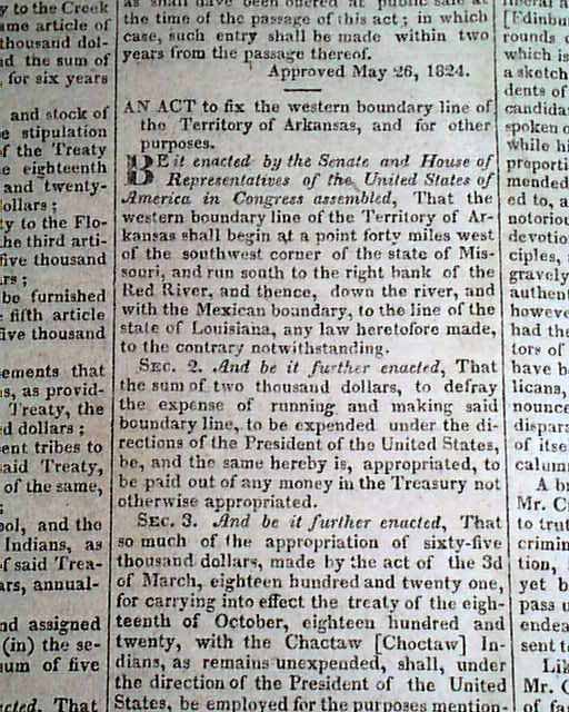 On the front page under Laws Of The United States are six Acts including one ...to fix the western boundary line of the Territory of Arkansas, and for other purposes. Other news of the day includes: "Gen. Lafayette" "Vermont Election" "Cincinnati Dinner" "Pairates" and much more. Several interesting advertisements as well. Stray writing above the masthead, otherwise in nice condition. 4 pages.